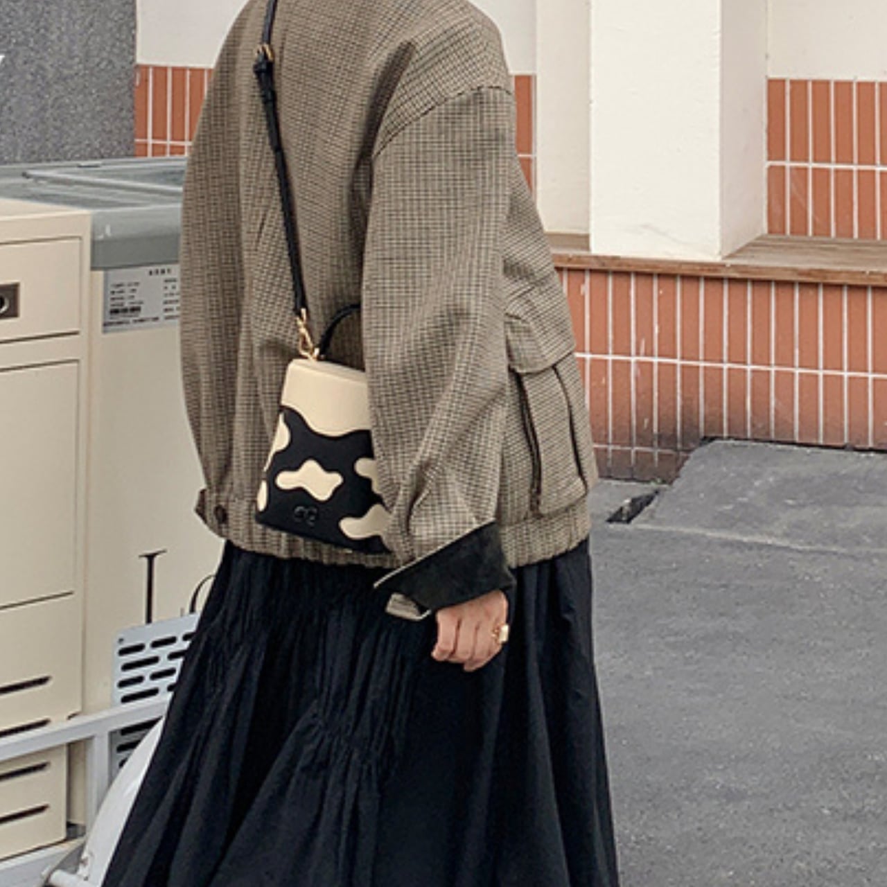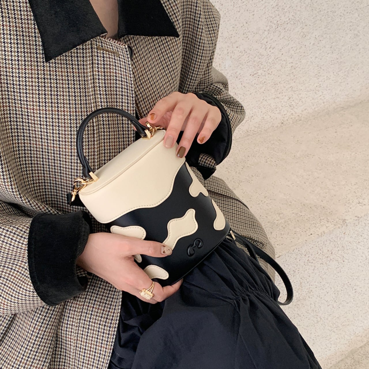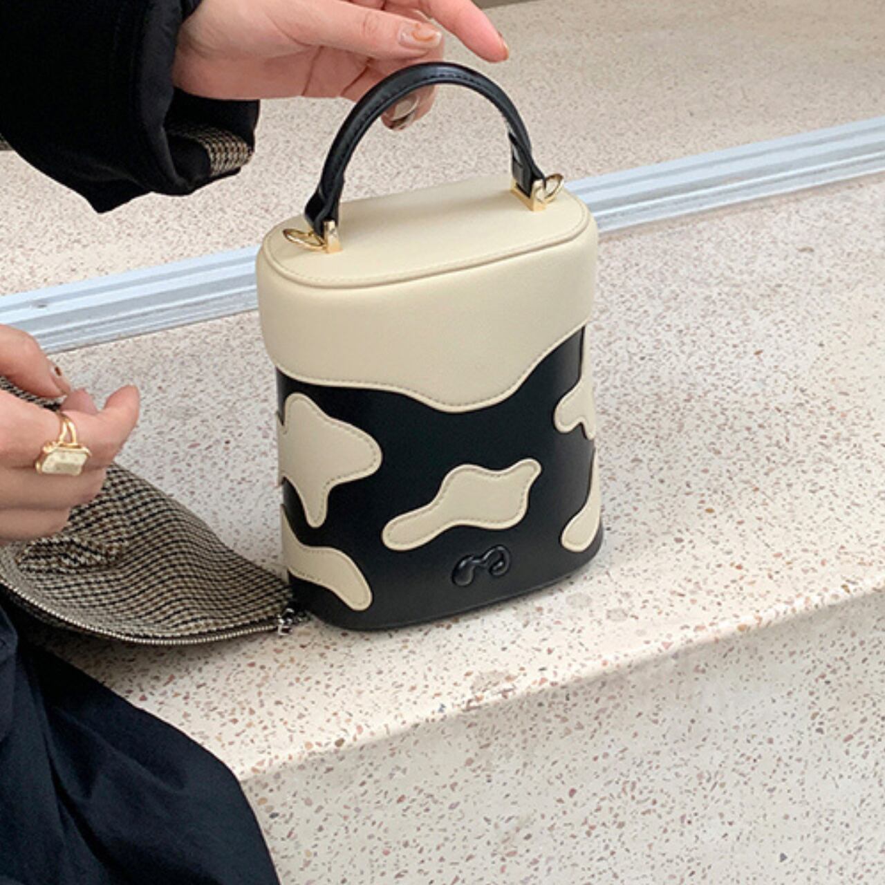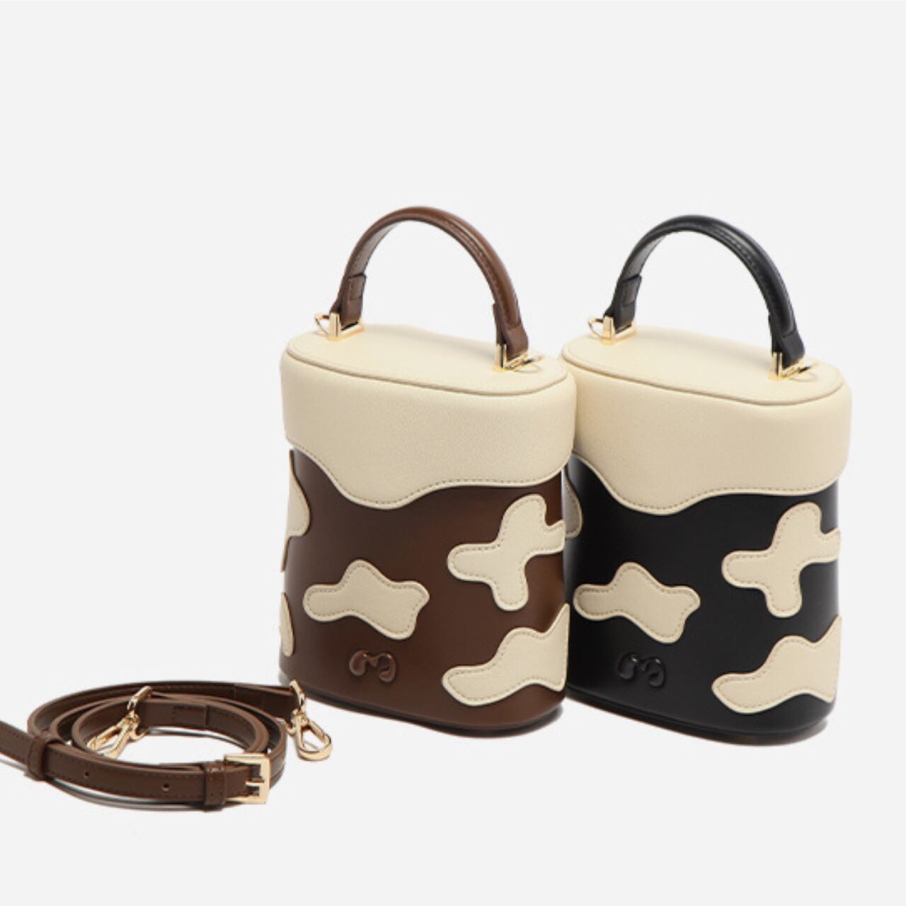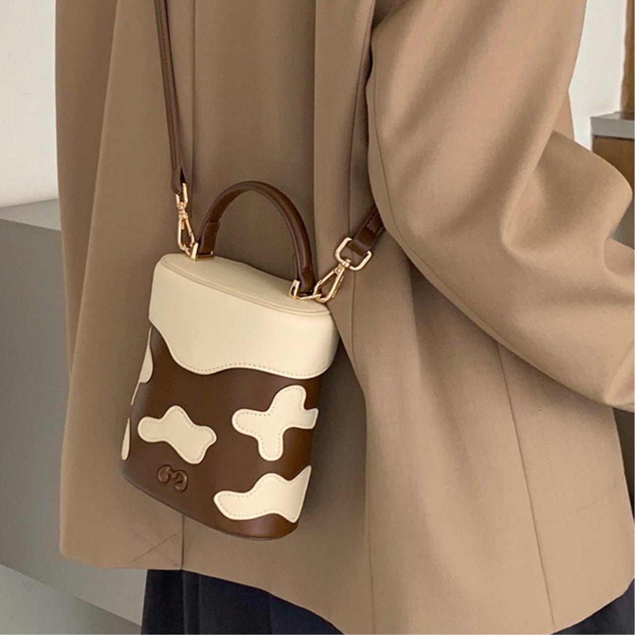 ナチュラルなベージュのキャンバス地に、ブラウンとホワイトの牛柄をあしらった遊び心満載のバケットバッグ。