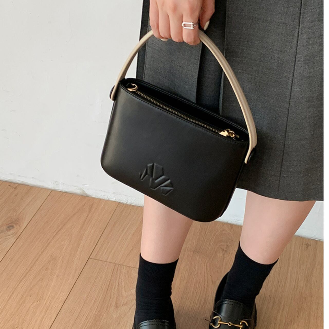 持ち手のコントラストカラーがスタイリングのアクセントになる、大人のミニハンドバッグ。