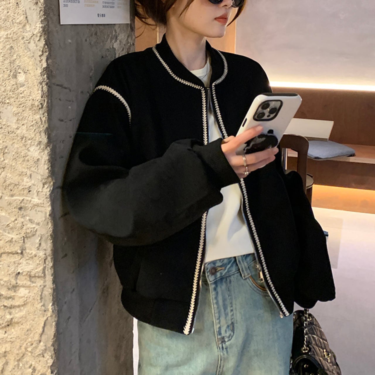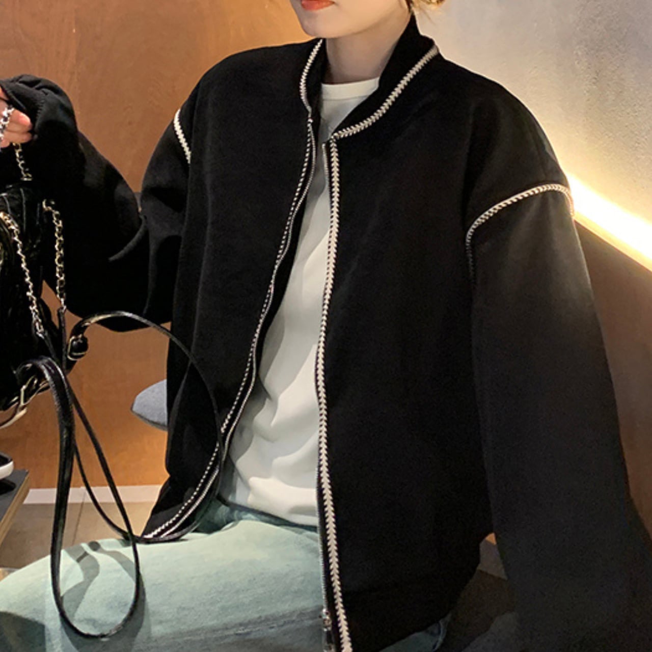 ブラックのボディにホワイトのステッチラインを効かせた、コントラストが印象的なショートジャケット。