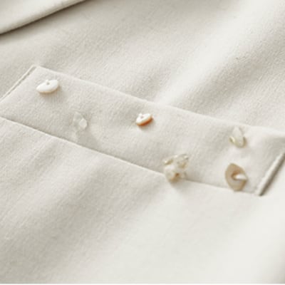 程よいオーバーサイズと美しいボタンの配列が、凛としながらも親しみやすい印象を演出します。