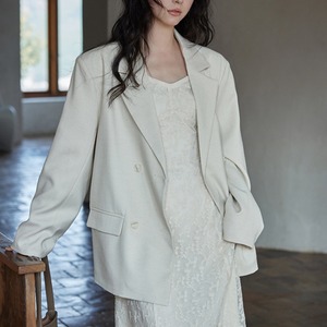 クラシカルなダブルブレストデザインを、現代的なシルエットに落とし込んだジャケット。