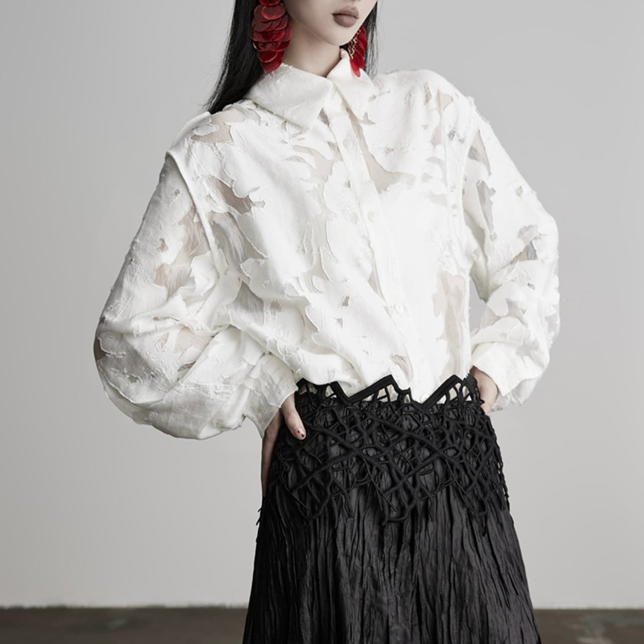 軽やかなシアー素材が、肌が透けて見えるほどの絶妙な透明感を演出します。
