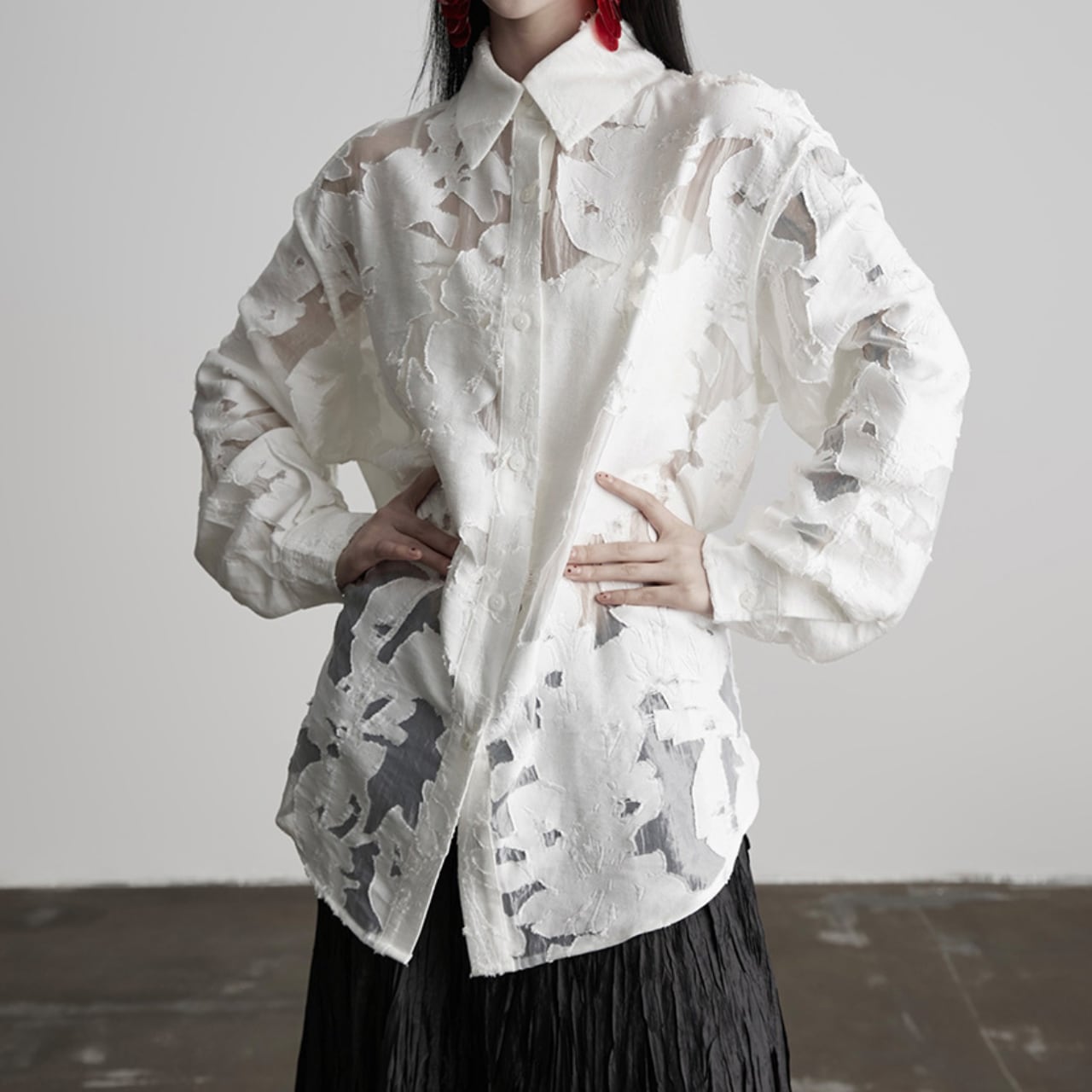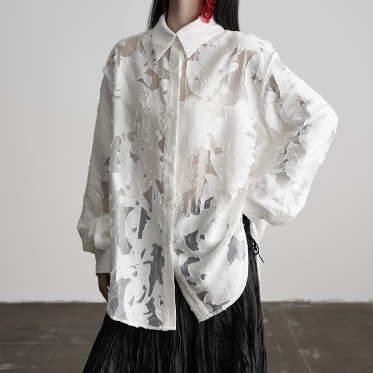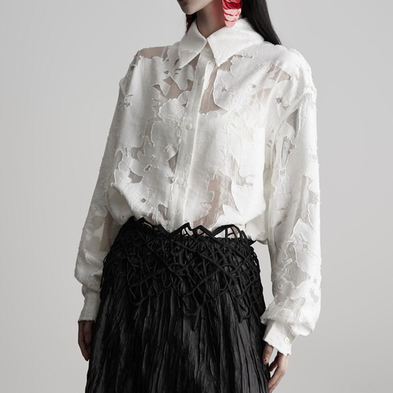 ホワイトのシアーデザインシャツ。