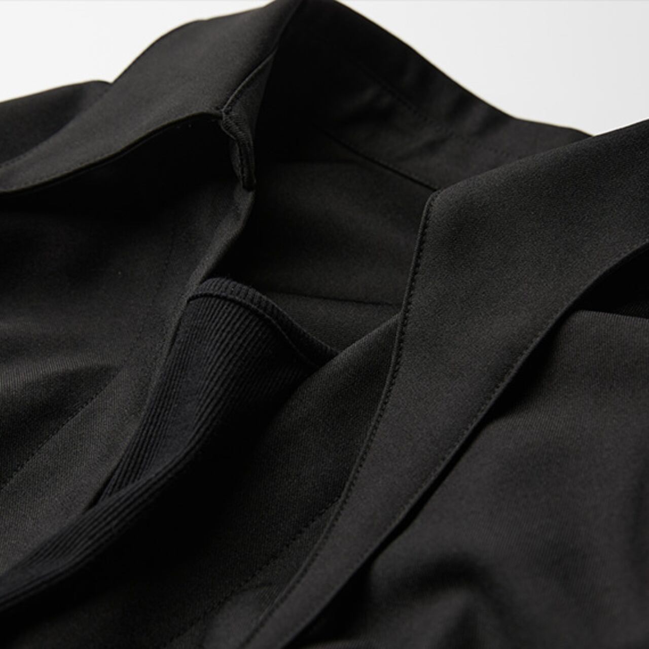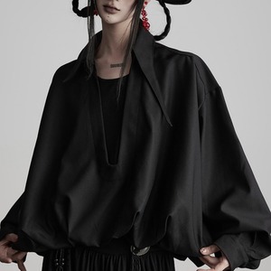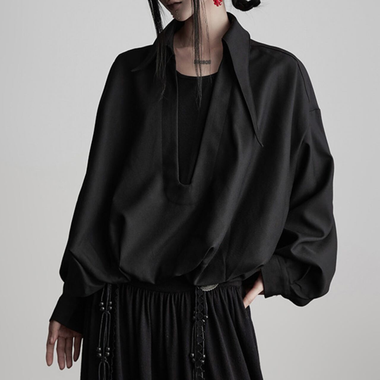 三角形の襟が生み出すシャープで幾何学的なラインが特徴のブラックシャツ。