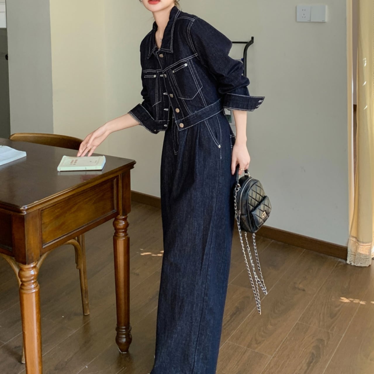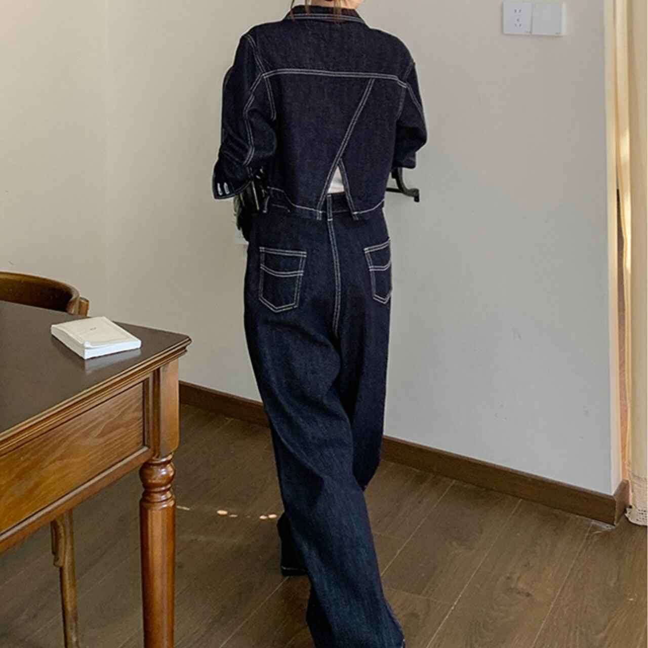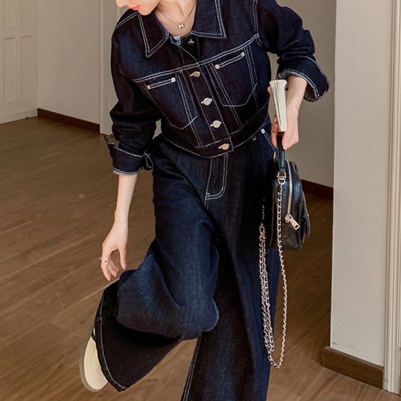 深みのあるダークネイビーデニムで仕立てた、ジャケットとワイドパンツのセットアップ。