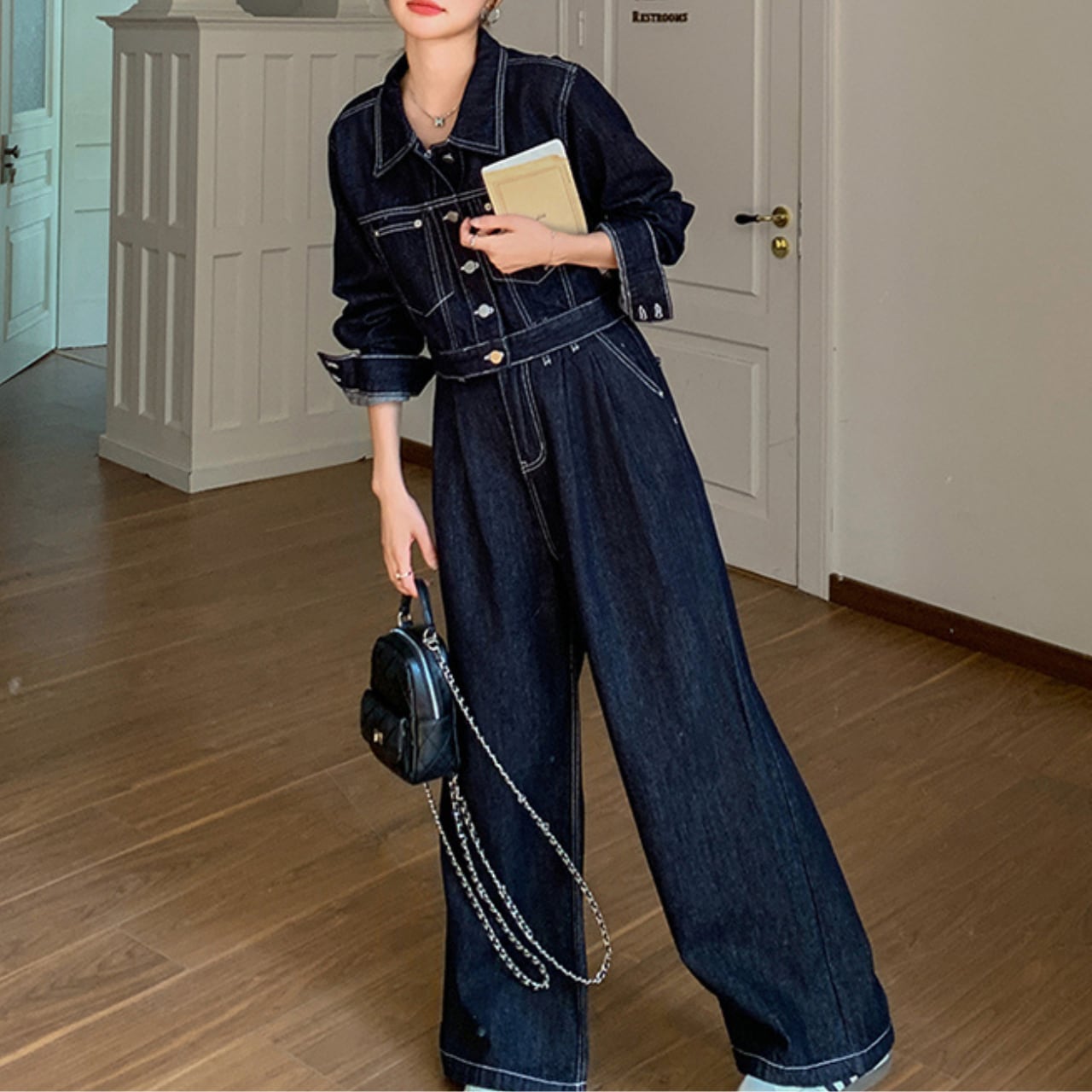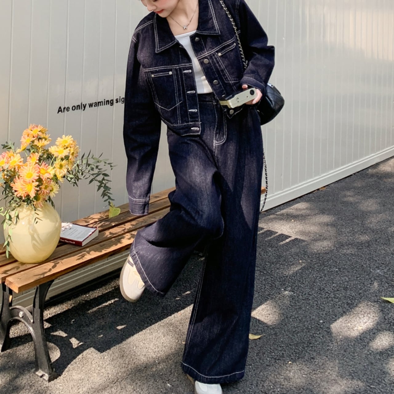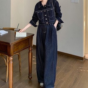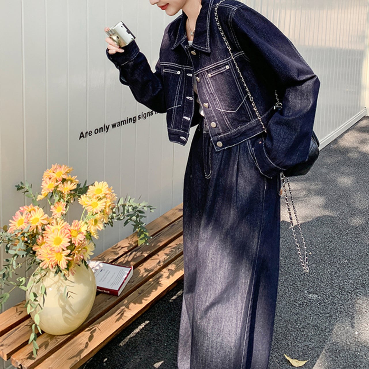 深みのあるダークネイビーデニムで仕立てた、ジャケットとワイドパンツのセットアップ。