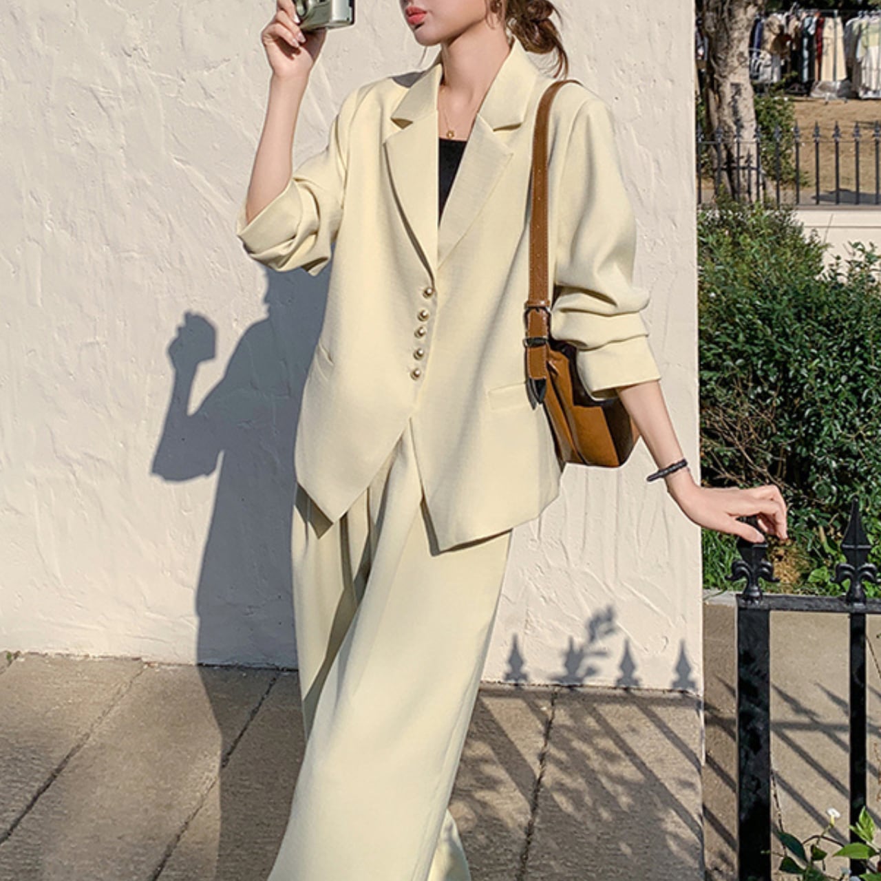 清潔感と洗練を兼ね備えた、ベージュのジャケット×パンツのツーピースセット。
