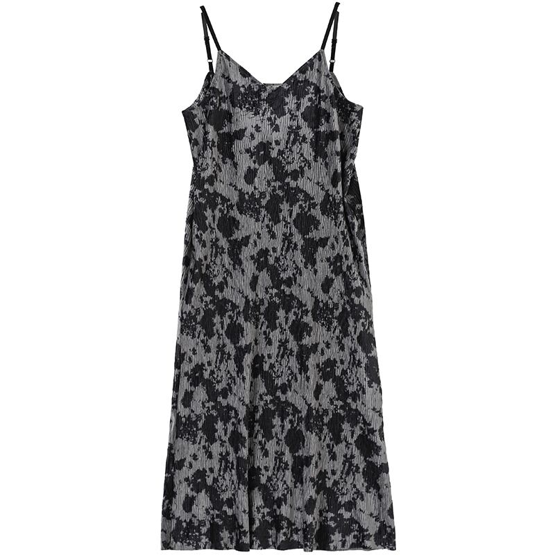 グレーベースにブラックの個性的な柄が映えるサスペンダーワンピース。