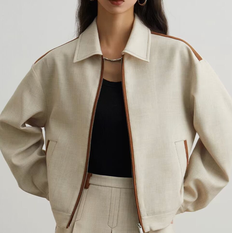 洗練されたデザインが際立つこのジャケットは、ホワイトとブラウンのコントラストカラーが魅力のアイテムです。