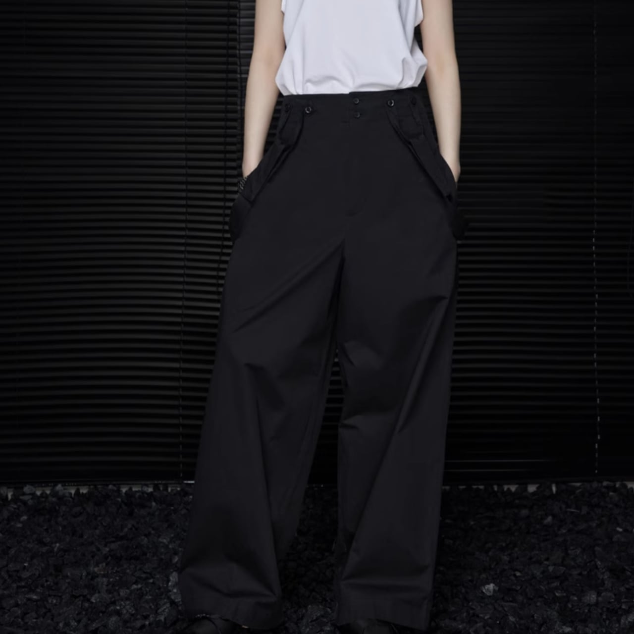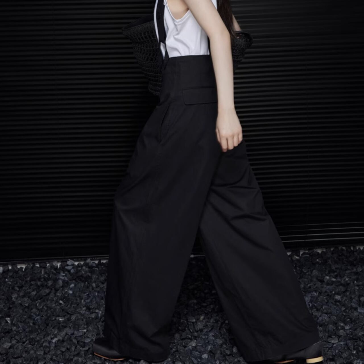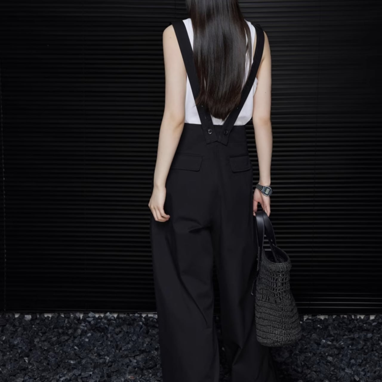 クラシカルなサスペンダーを纏った、ブラックのワイドパンツ。