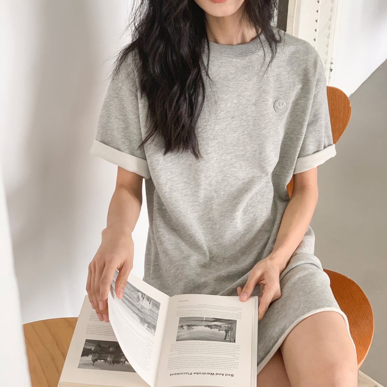 グレーのTシャツワンピース。