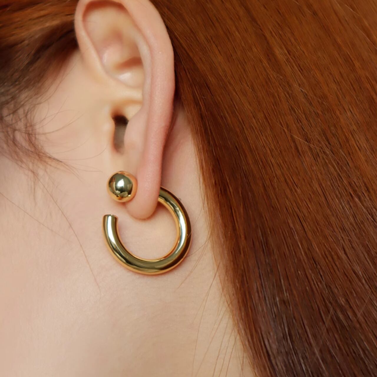 耳元で静かに輝く、艶やかなゴールドのC字型リング。
