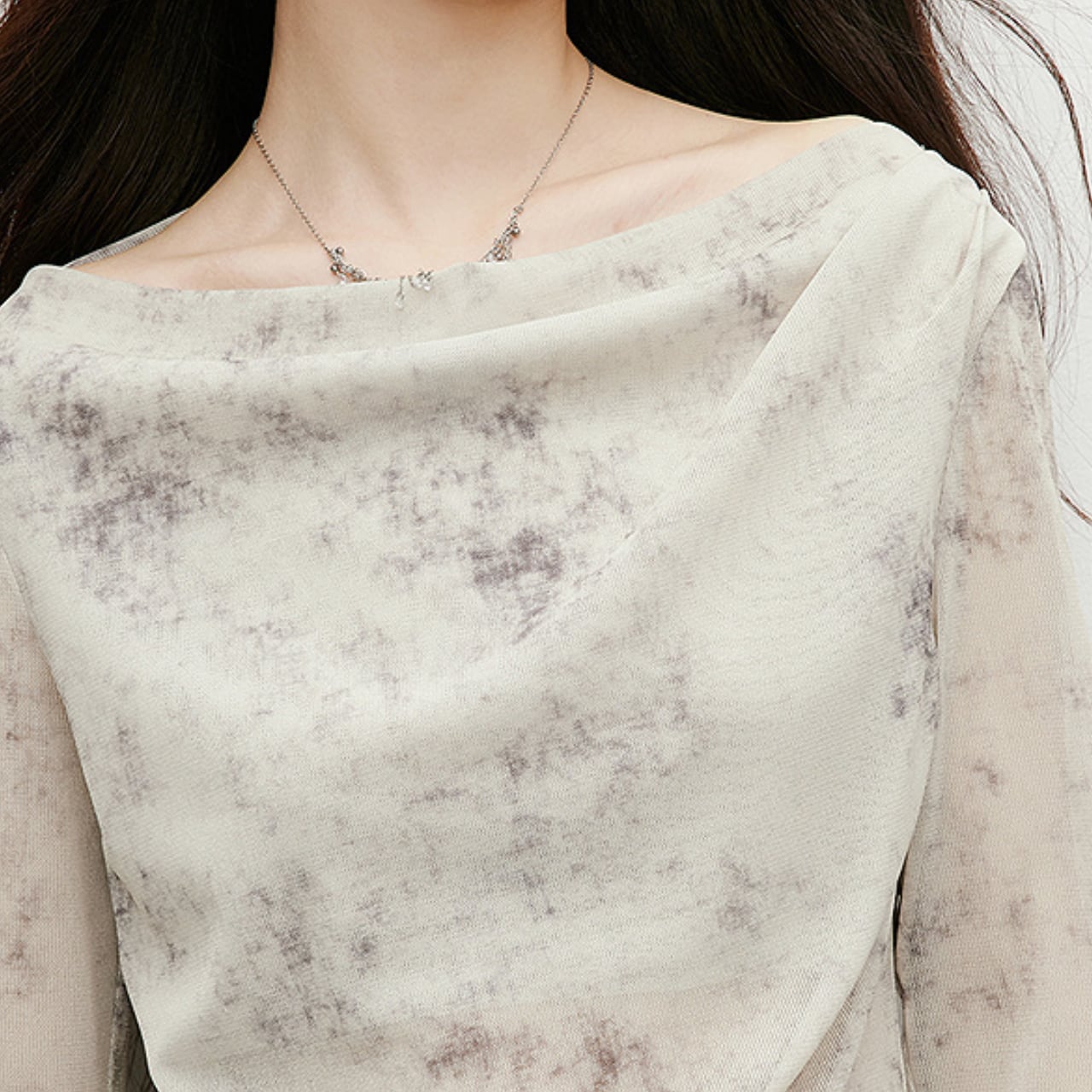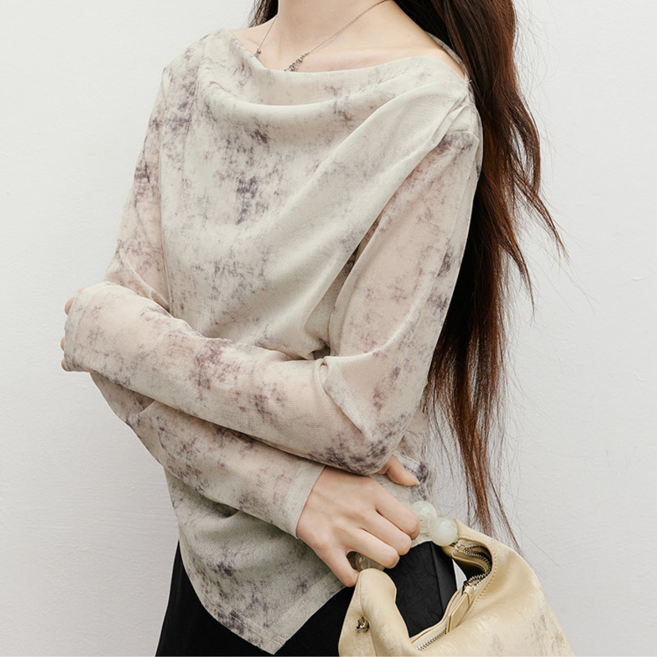 透け感のある上品なメッシュ素材と、女性らしいラウンドネックが魅力のトップス。