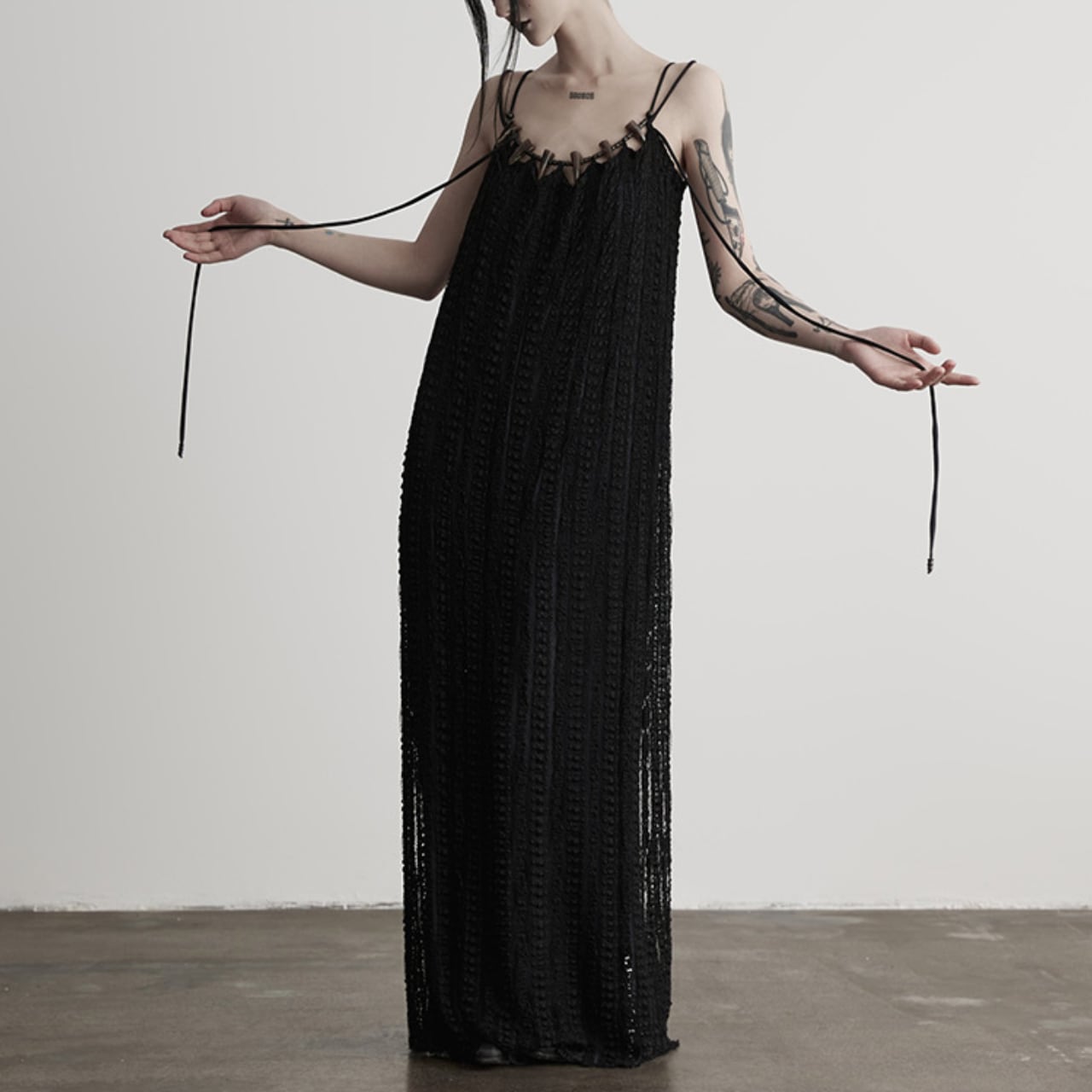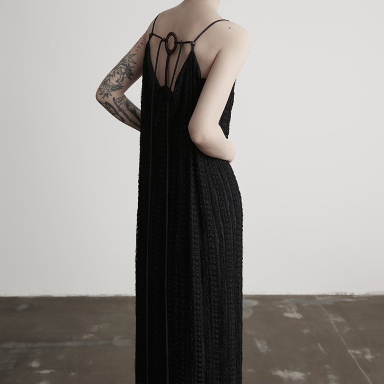 ホルターネック仕様でデコルテを上品に演出し、すっきりとしたマキシ丈で縦のラインを強調します。