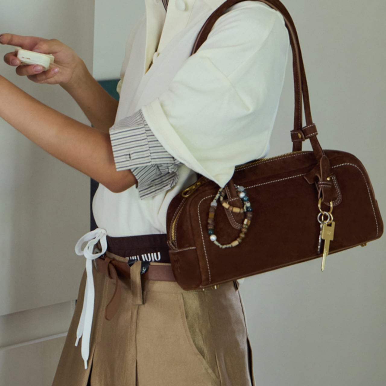 スエードロングショルダーバッグ。