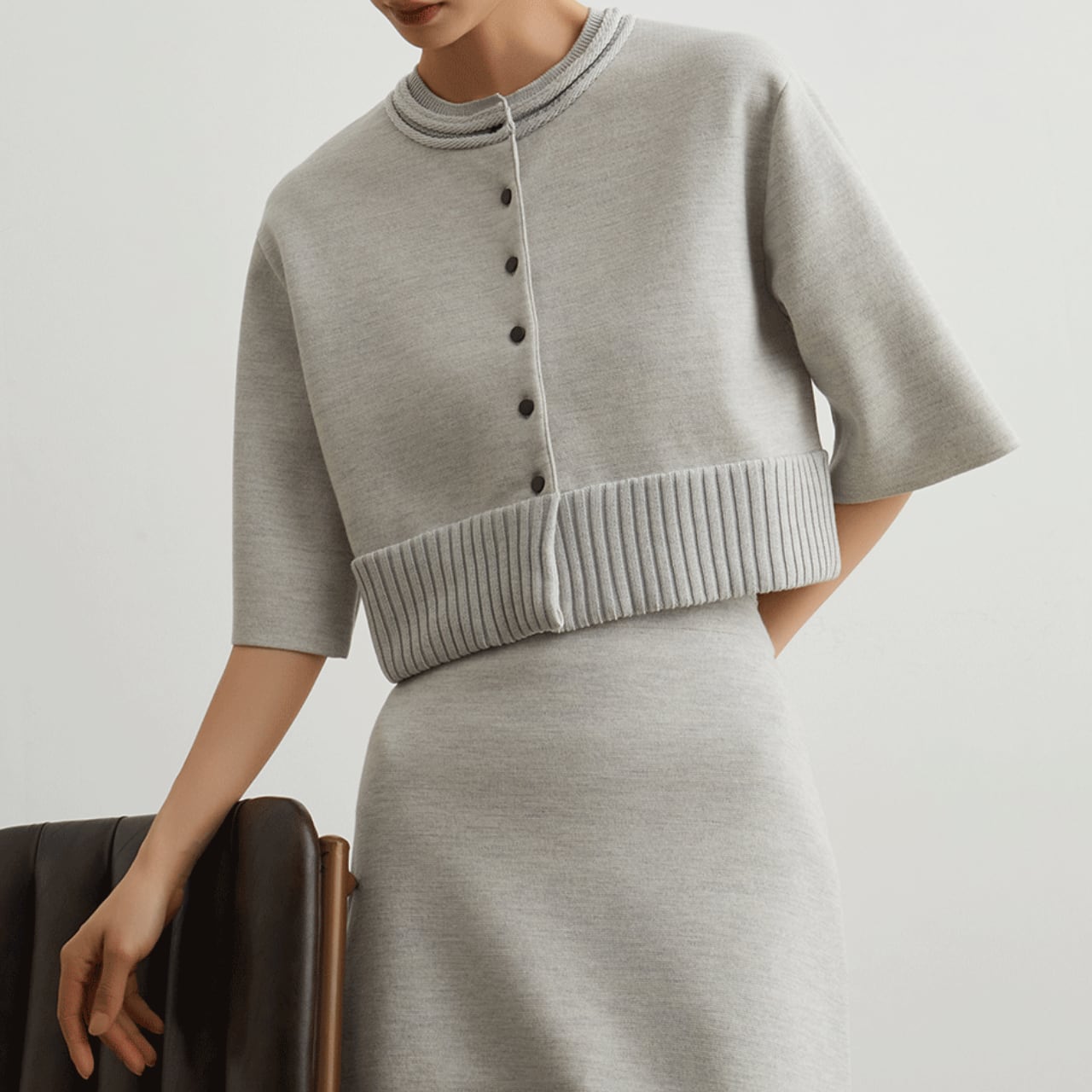 裾やネック部分はリブデザインが施されており、ショート丈なのでハイウエストのパンツやスカートと相性抜群です。