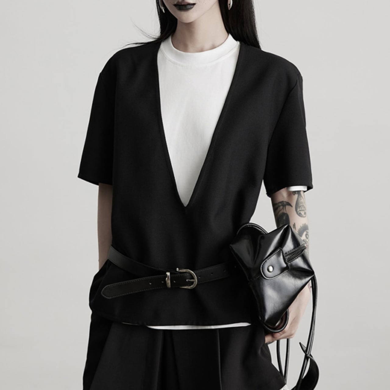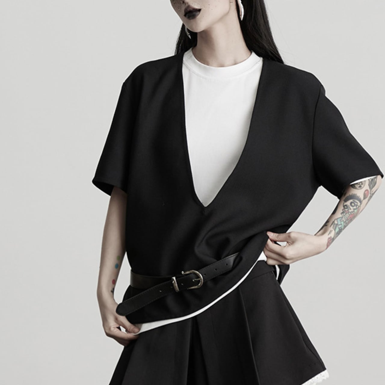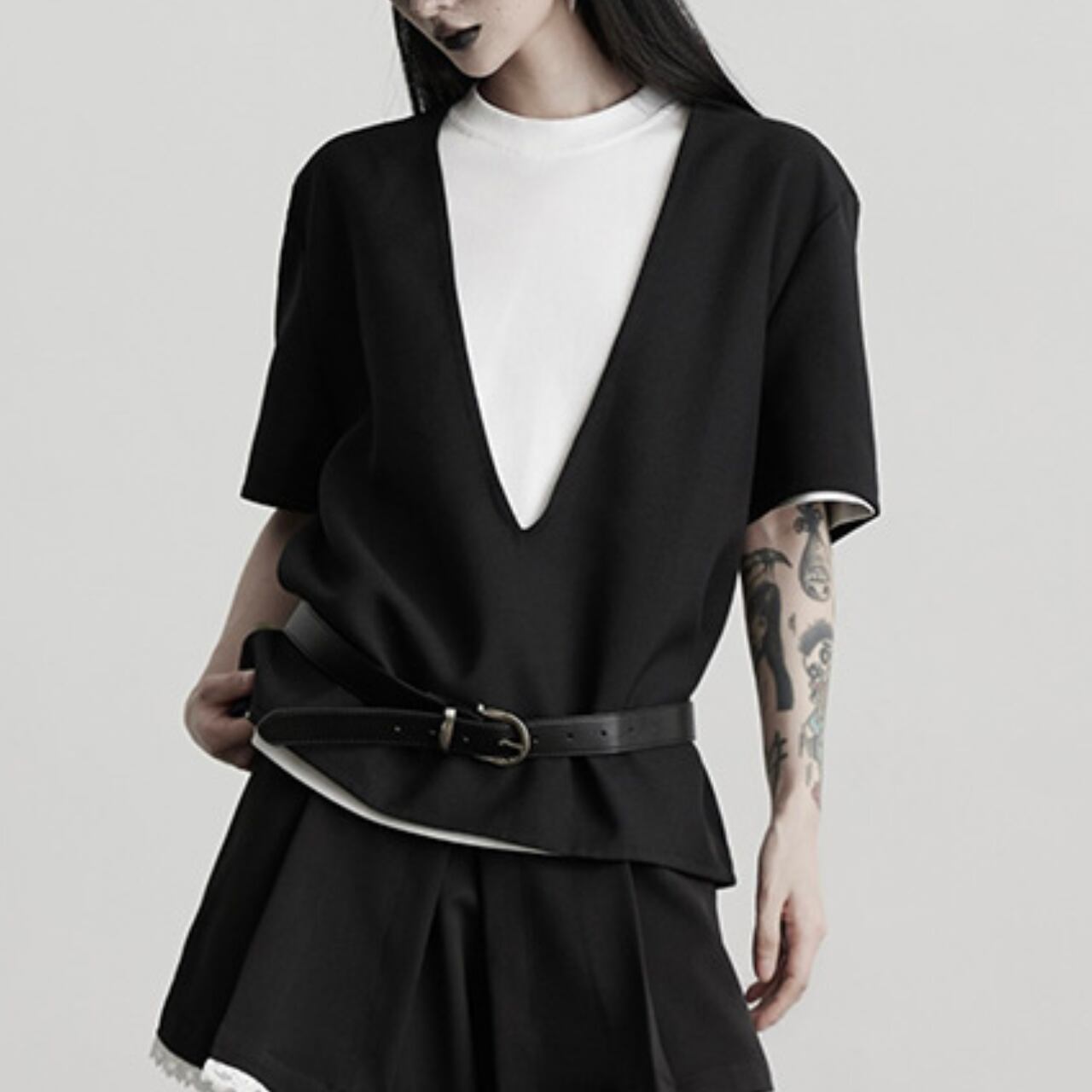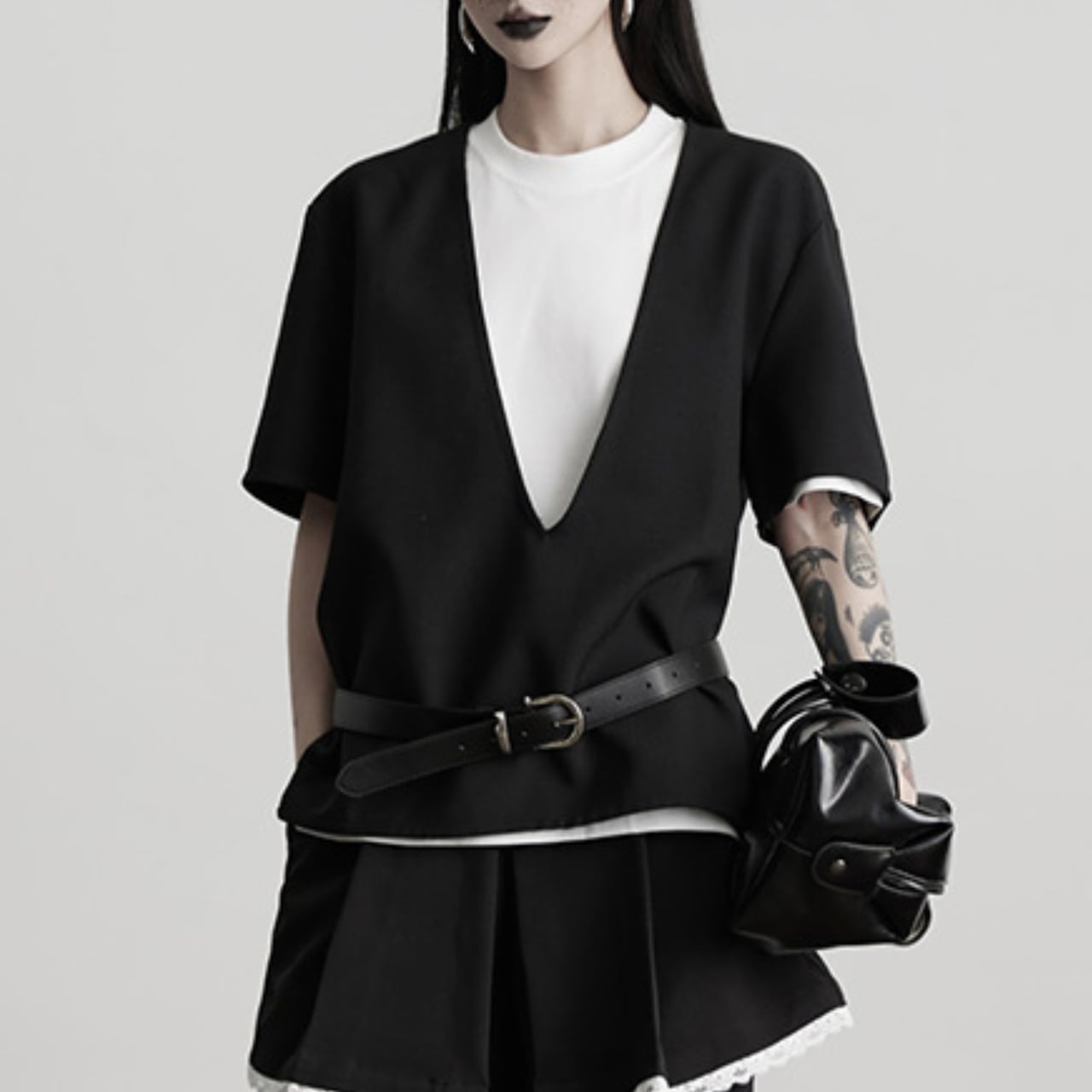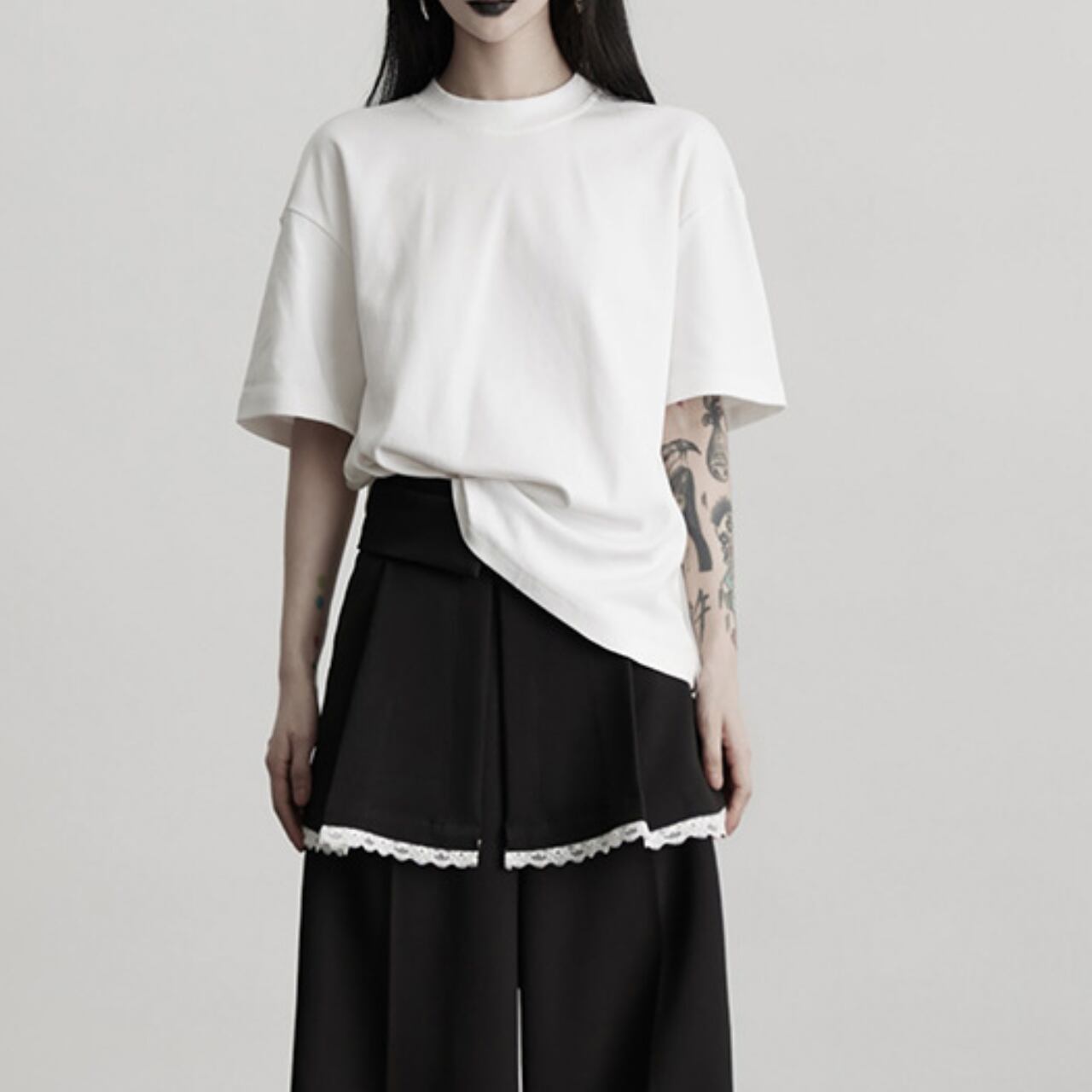 白と黒、二枚のTシャツが織りなすコントラストが、一瞬で「こなれ感」を演出します。
