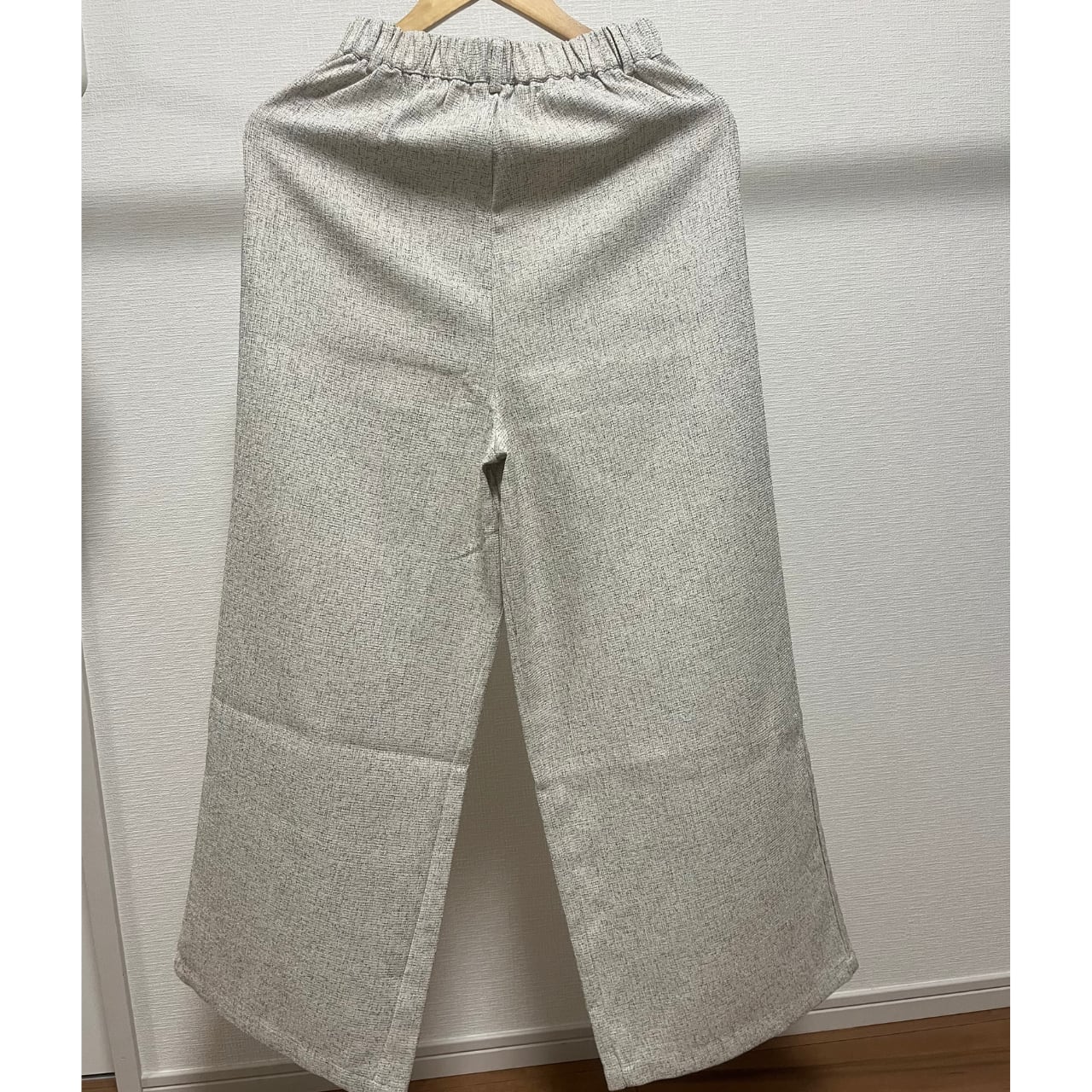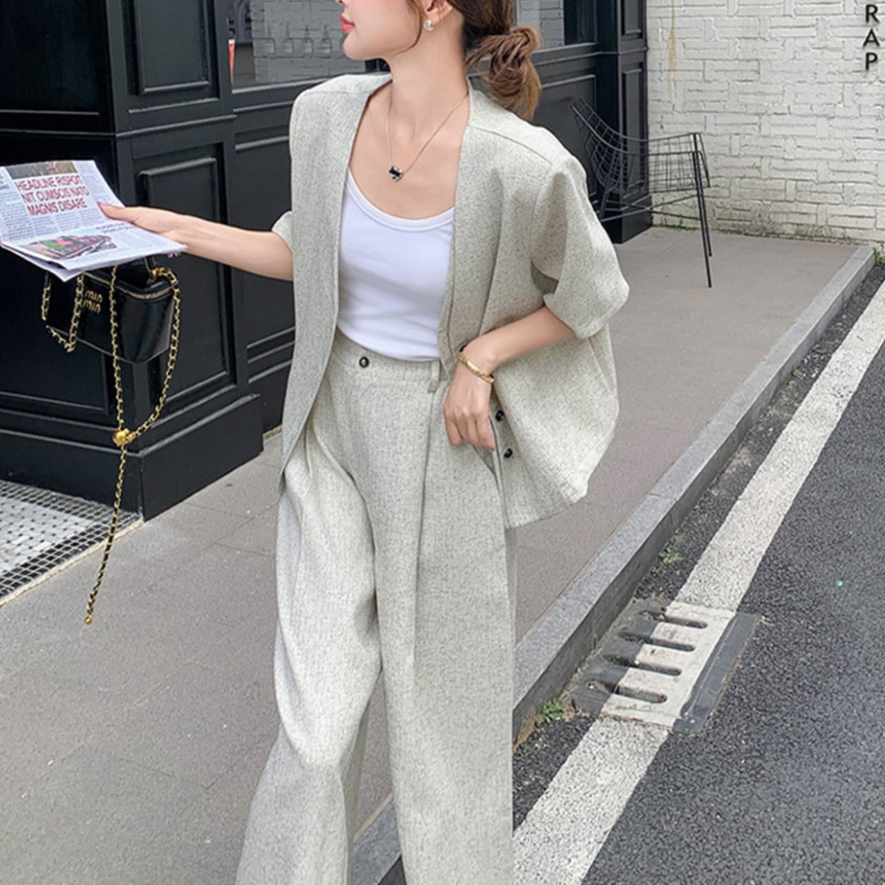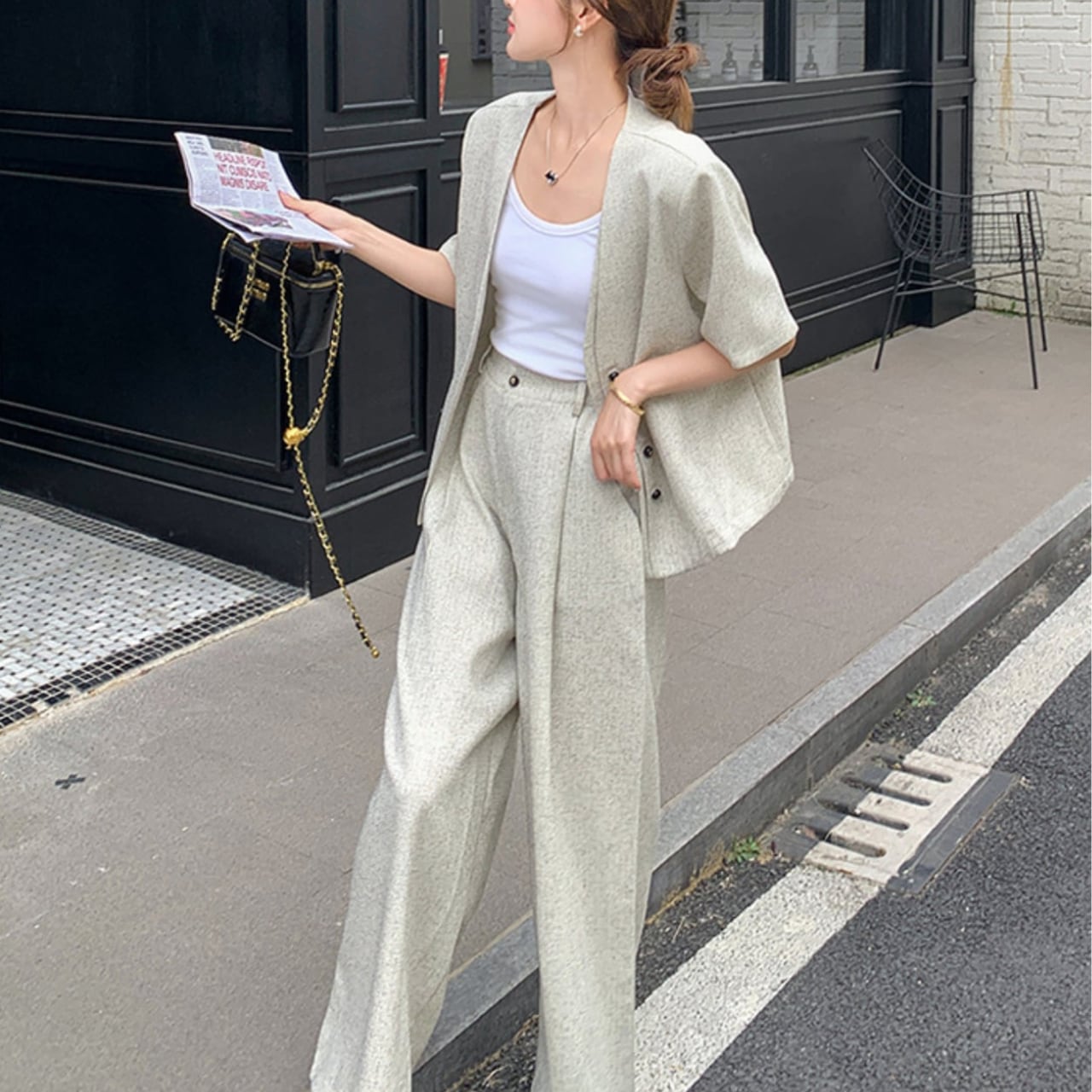 グレーの半袖トップス&ワイドレッグパンツセット。
