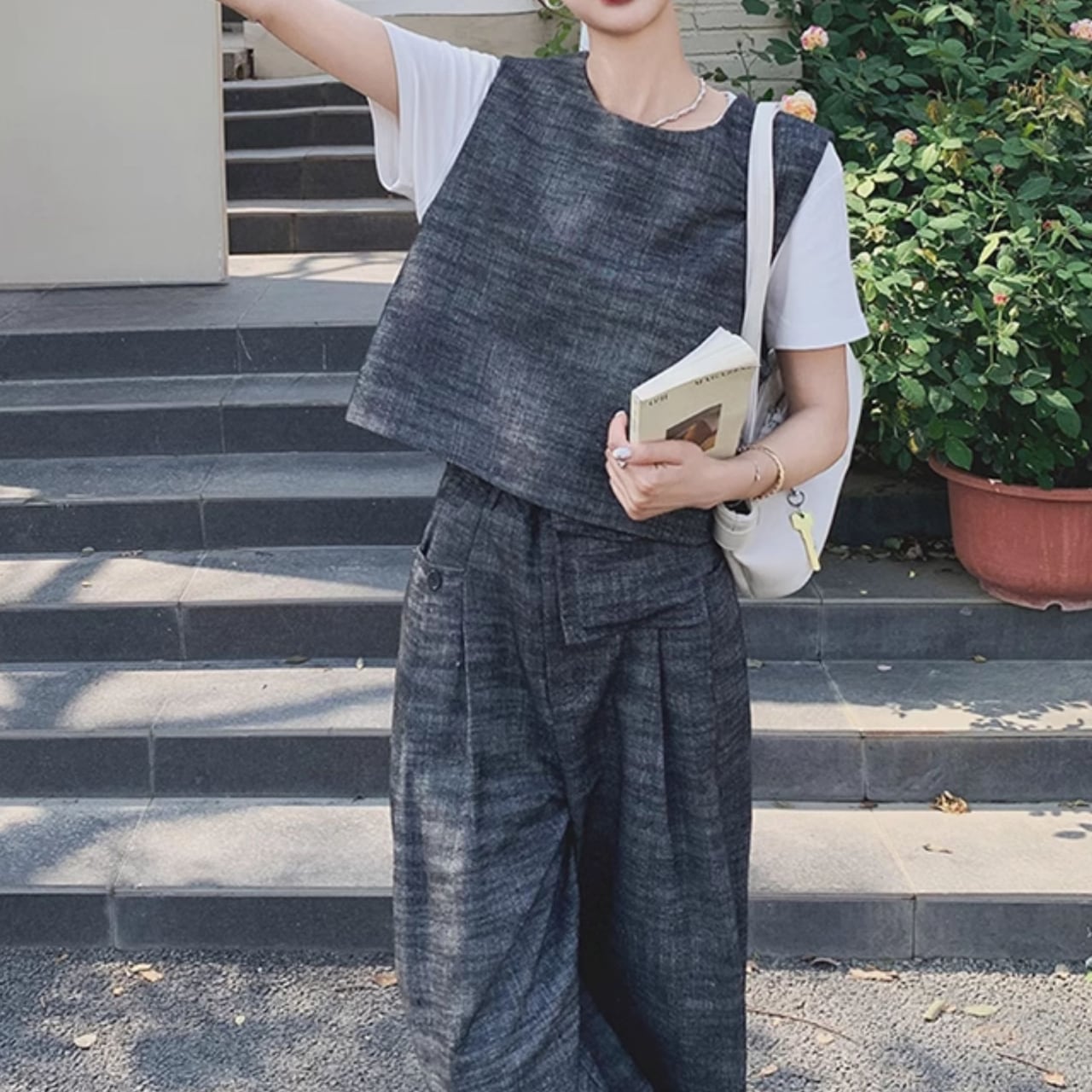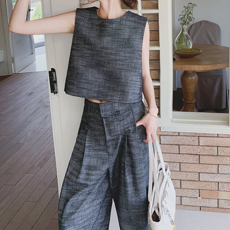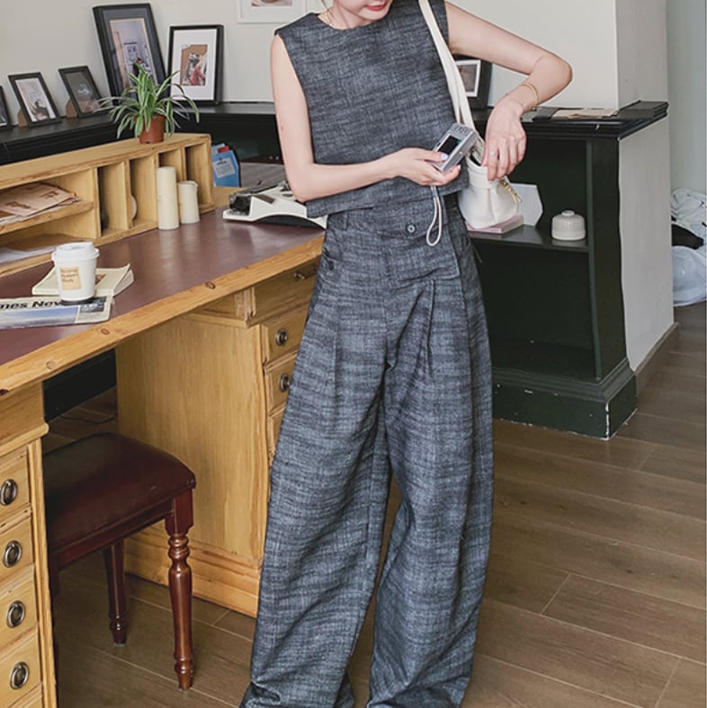 スタイリッシュなダークグレーのベストと、リラックス感のあるワイドレッグパンツがセットになったセットアップです。