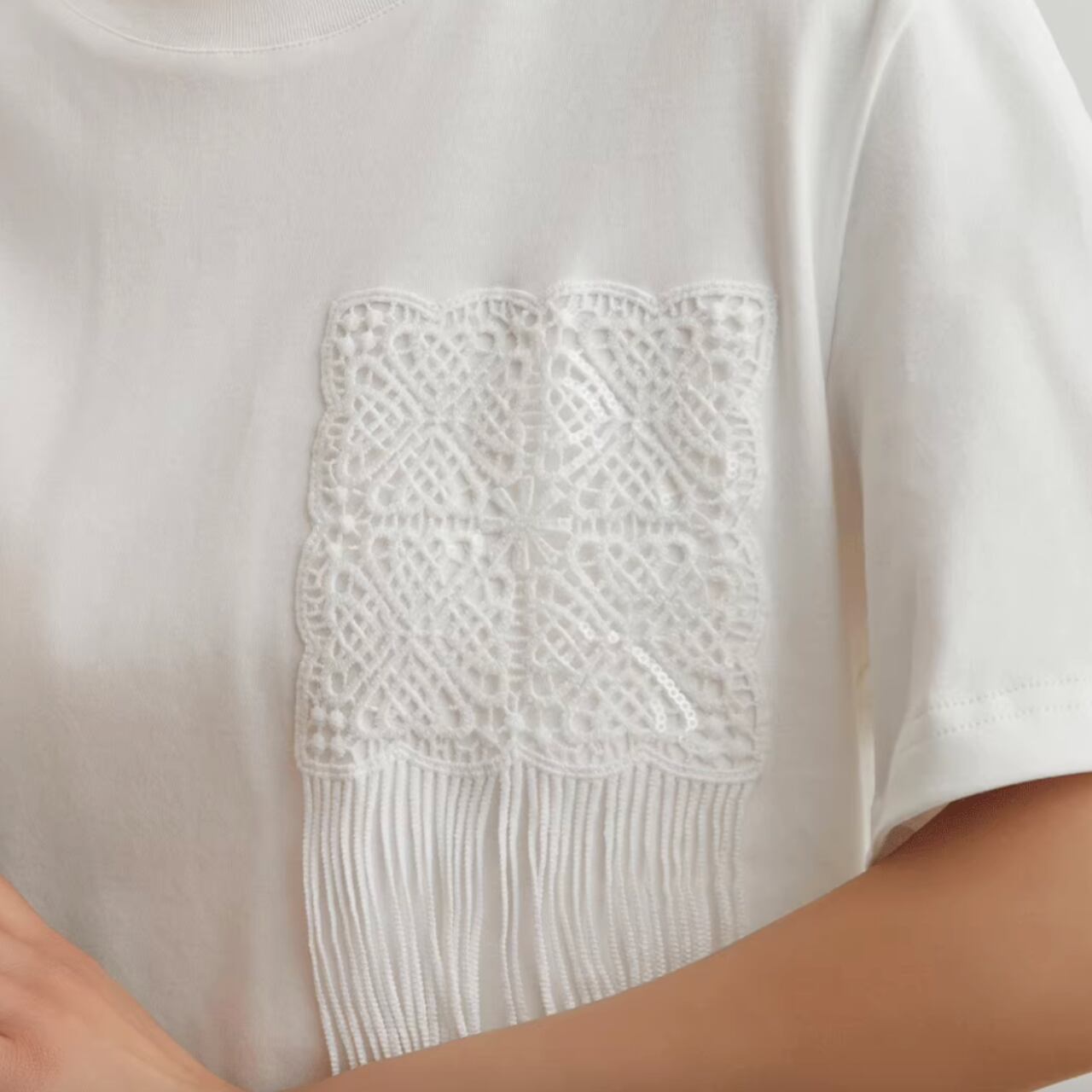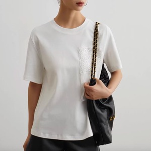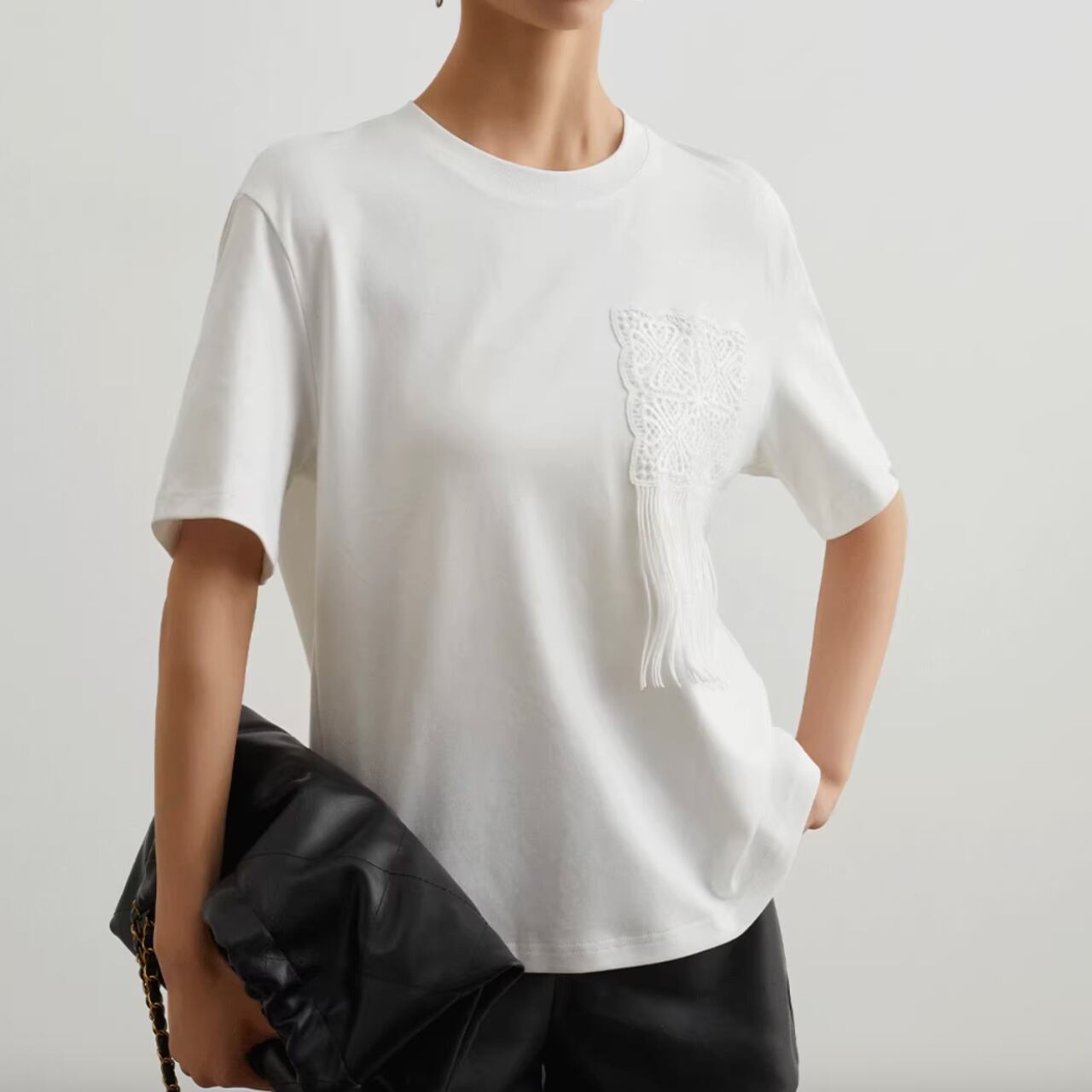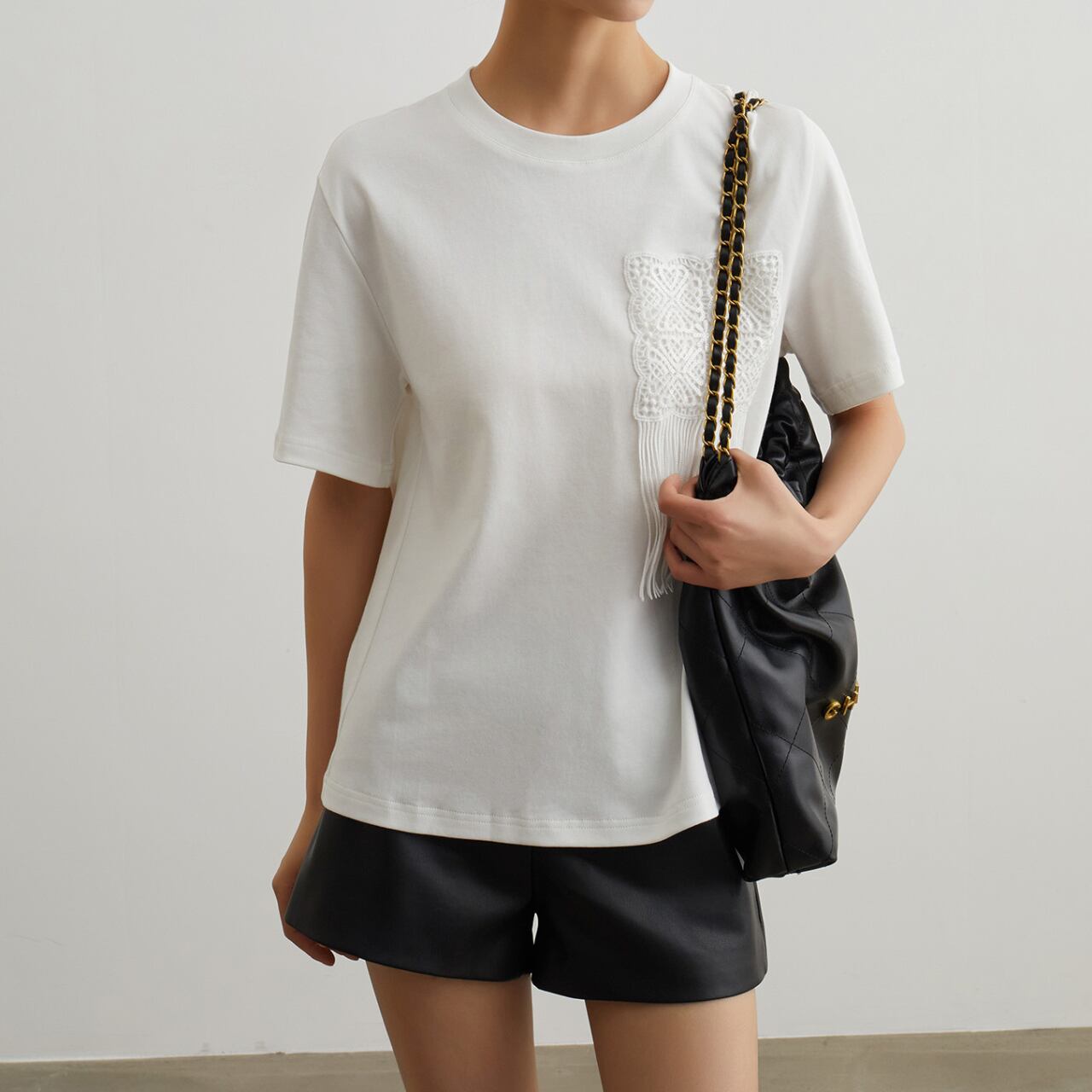 ベーシックな白Tシャツにユニークな胸元の装飾ディテールを組み合わせ、クラシックでありながらトレンディな雰囲気を醸し出すTシャツです。