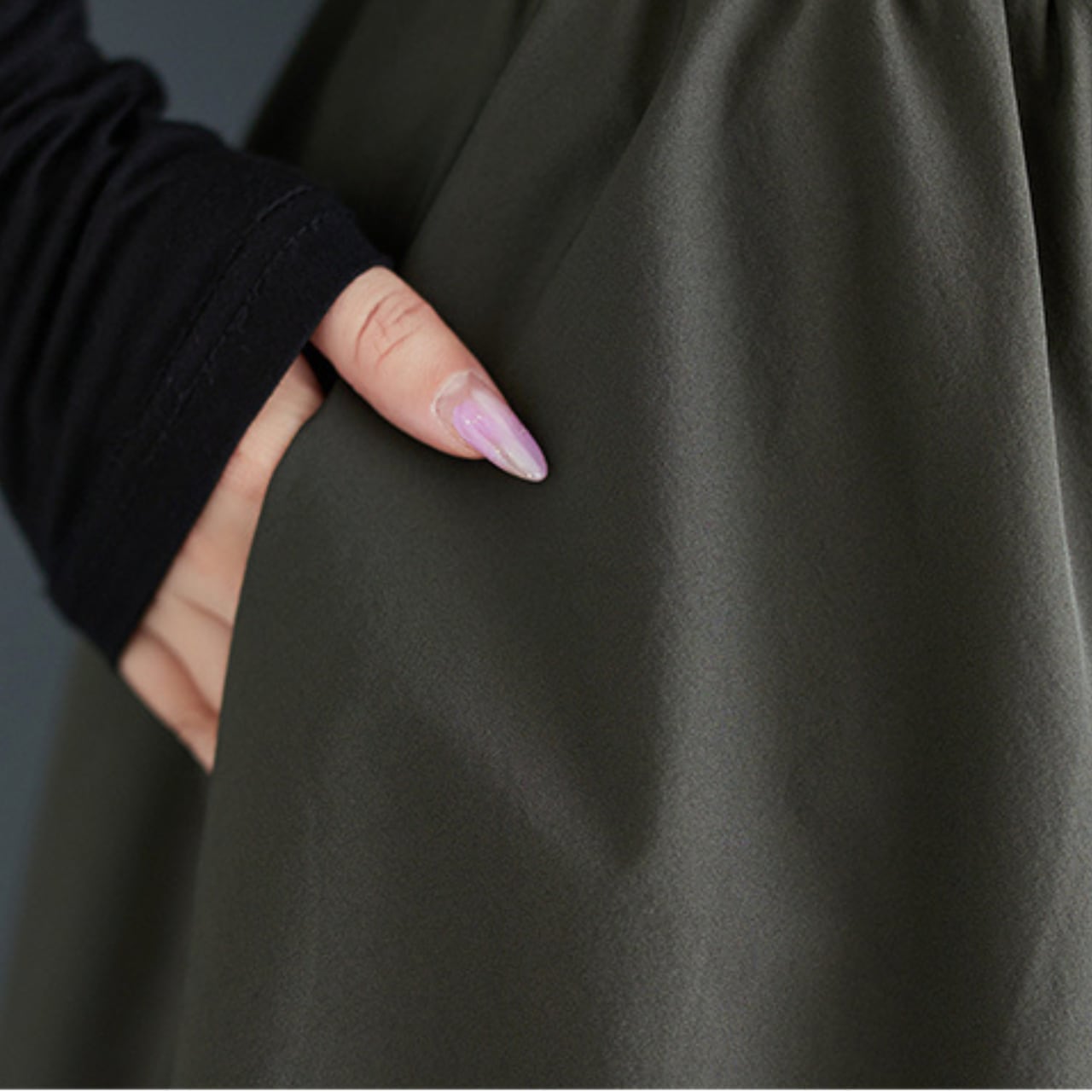 ハイウエストデザインで脚長効果も期待でき、体型カバーも完璧。左右非対称のヘムラインが視線を分散させ、スタイルアップを叶える計算されたデザインです。