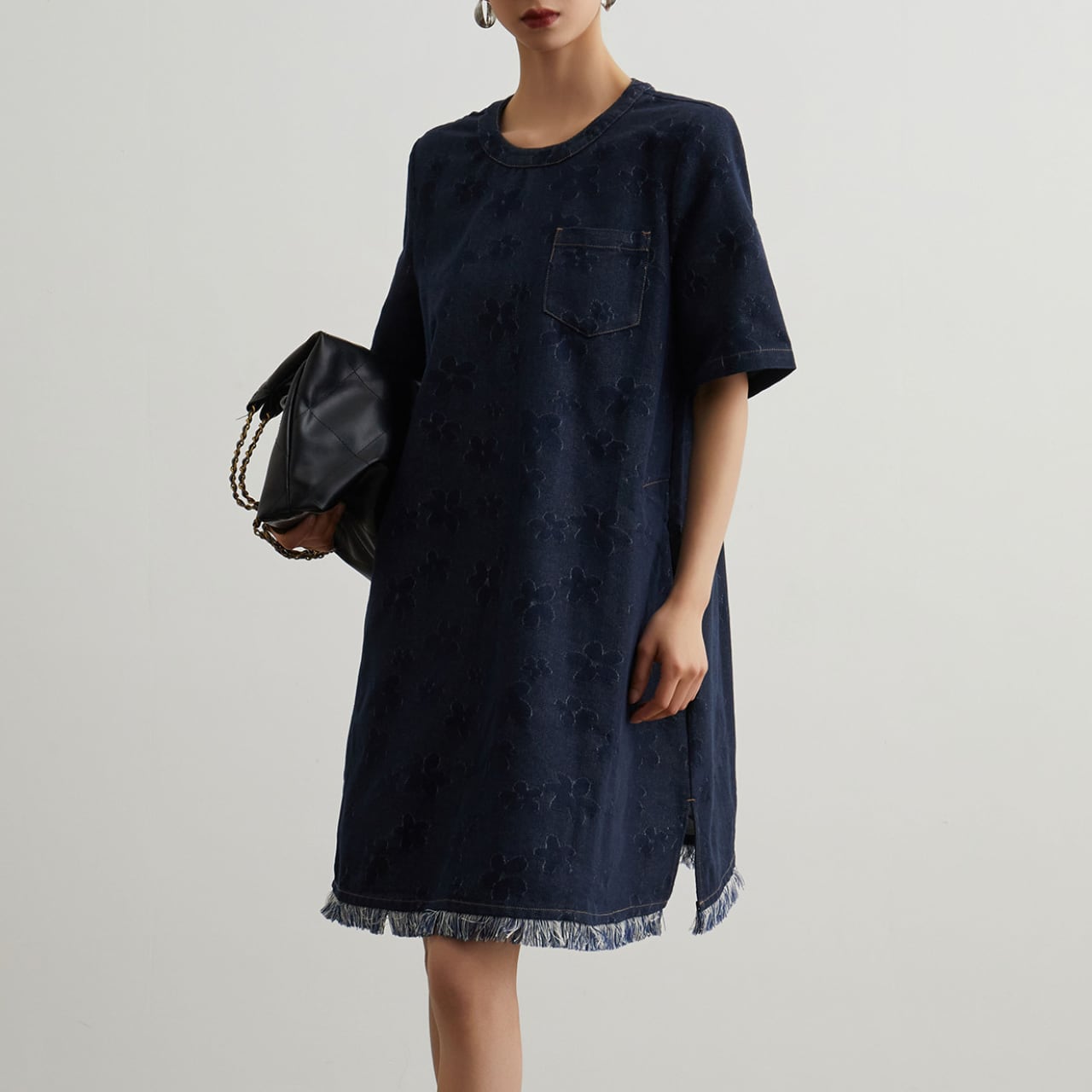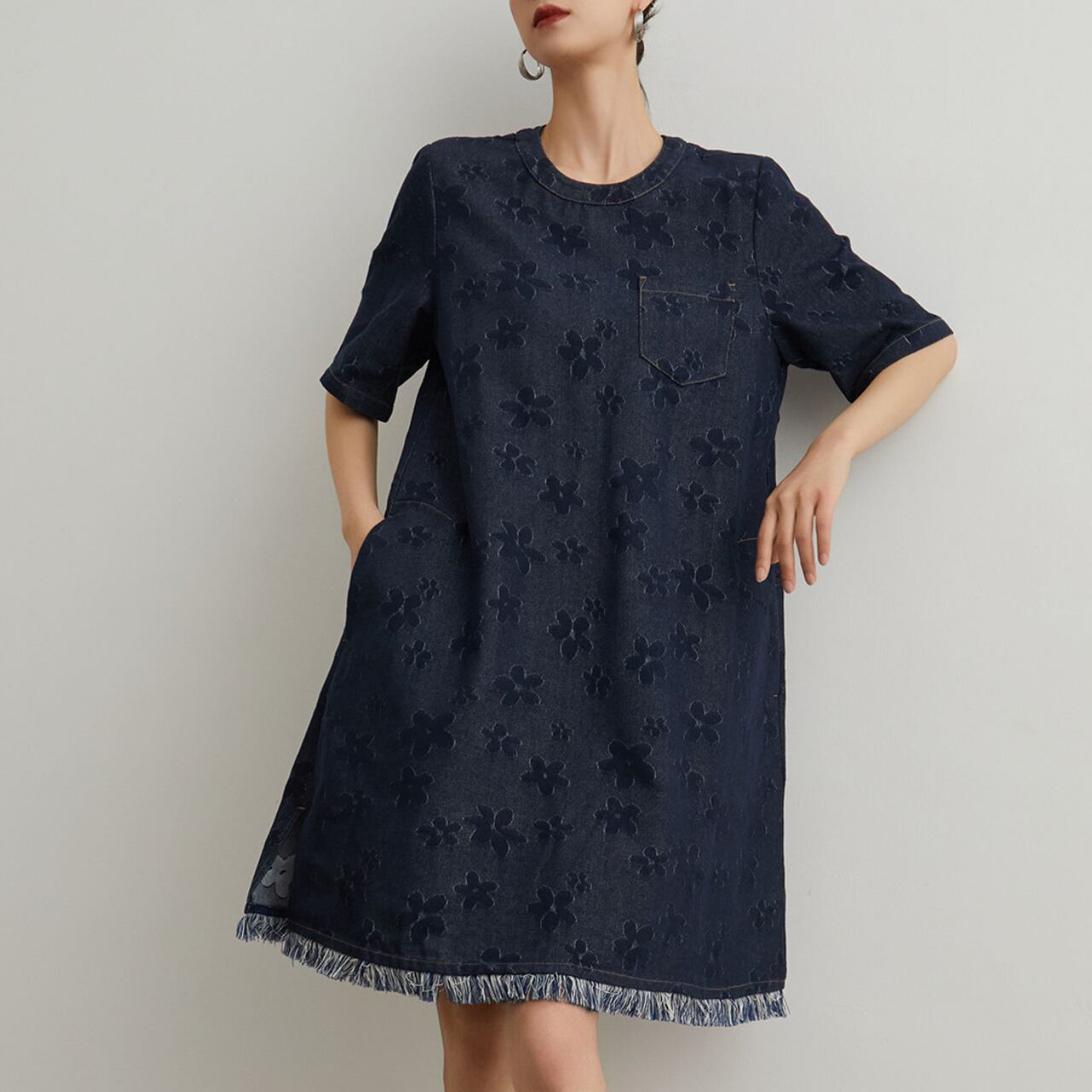 デニムに華やかな花柄デザイン、裾にはフリンジデザインが施されているワンピースです。