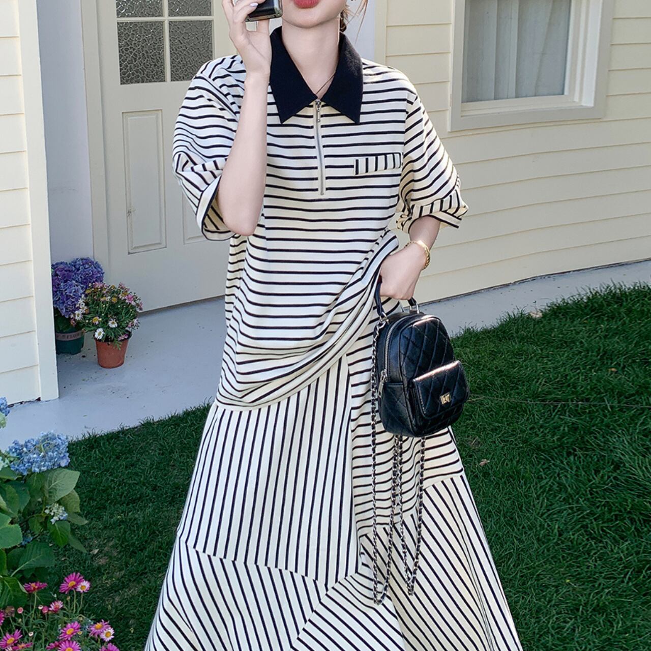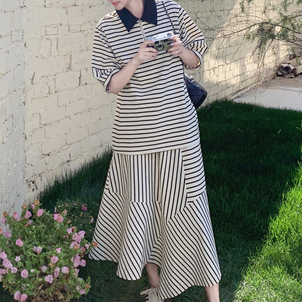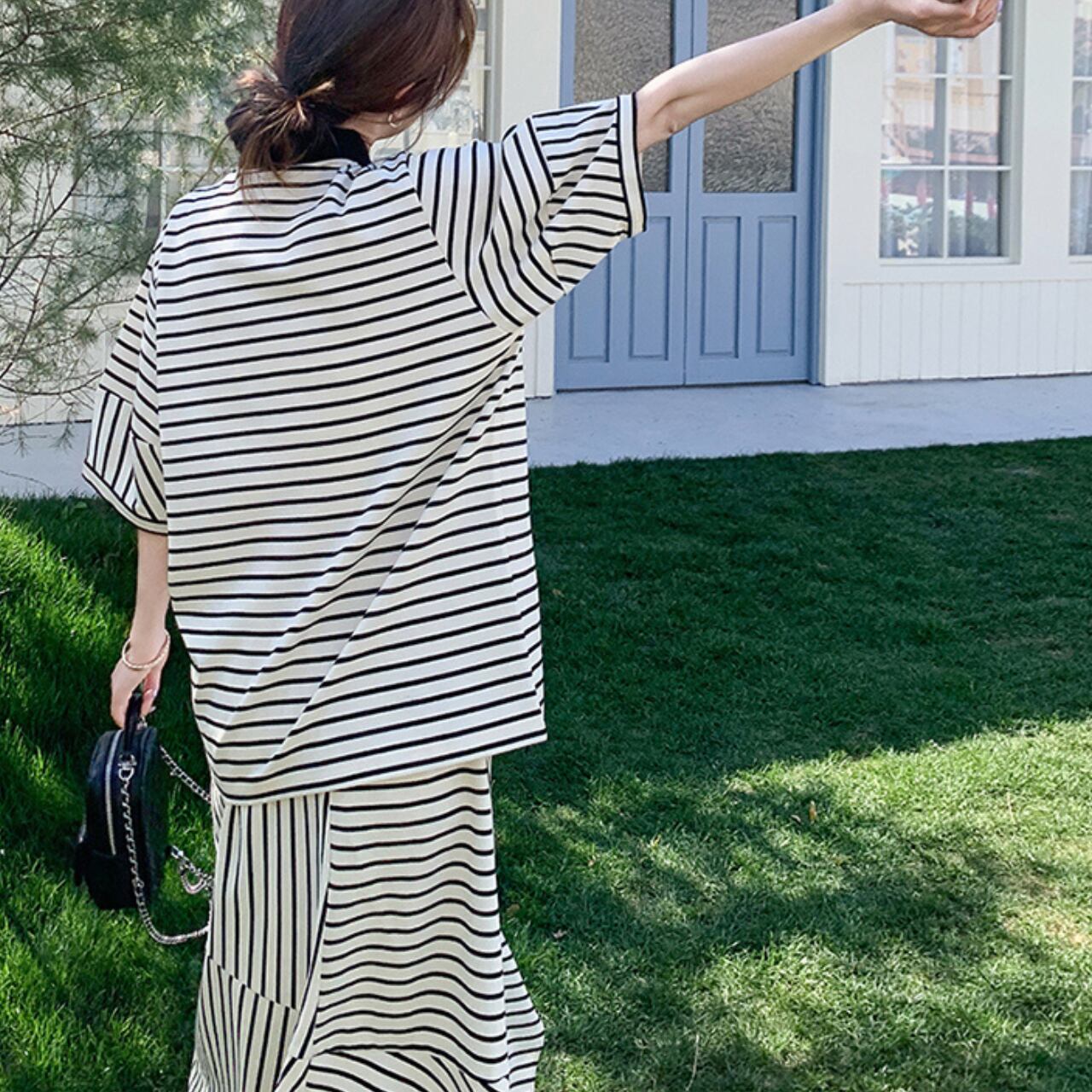 Striped polo collar T-shirt & skirt set S774