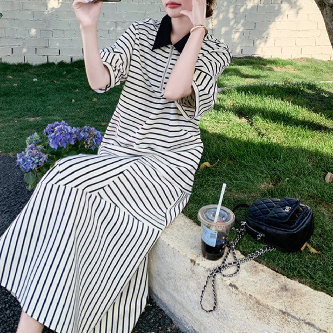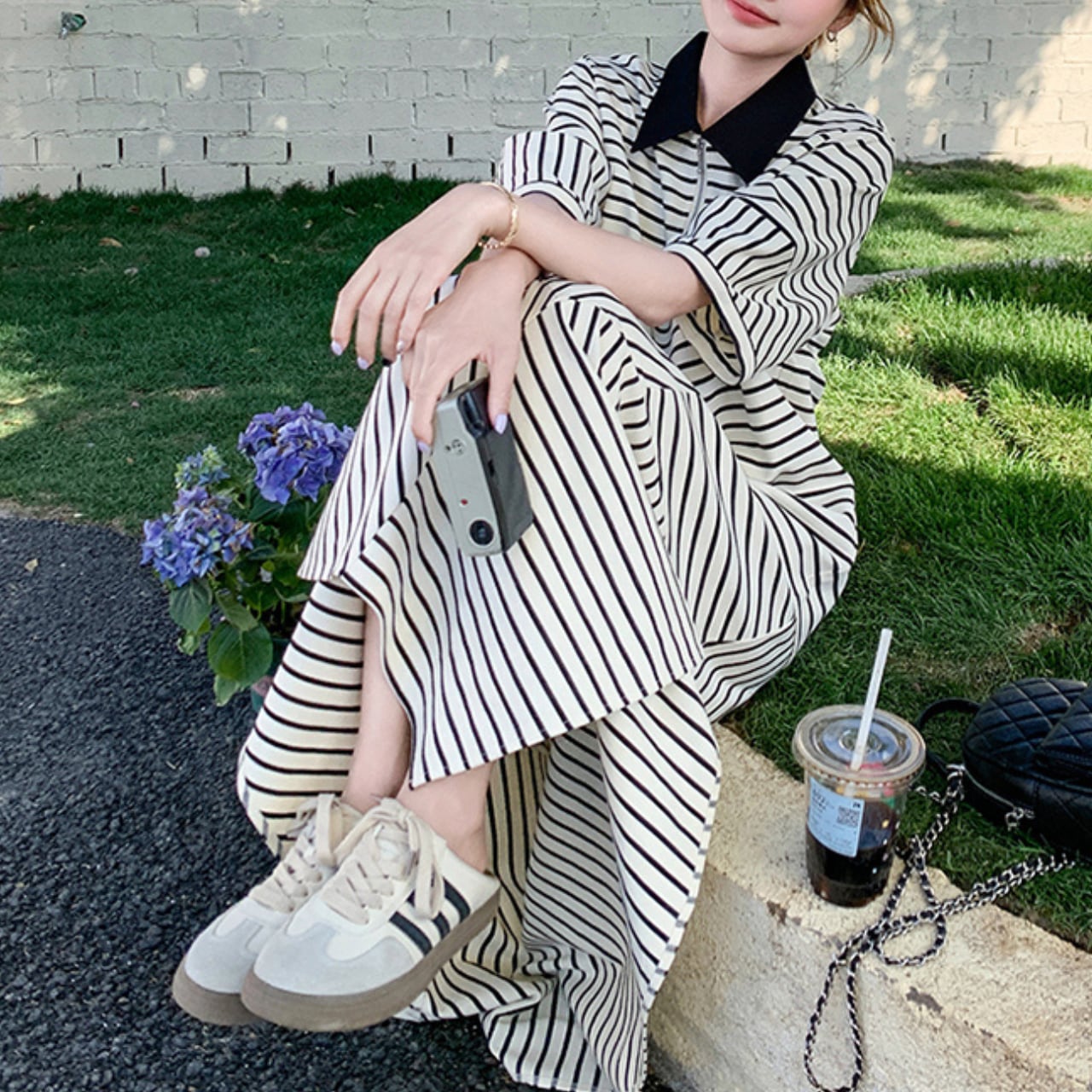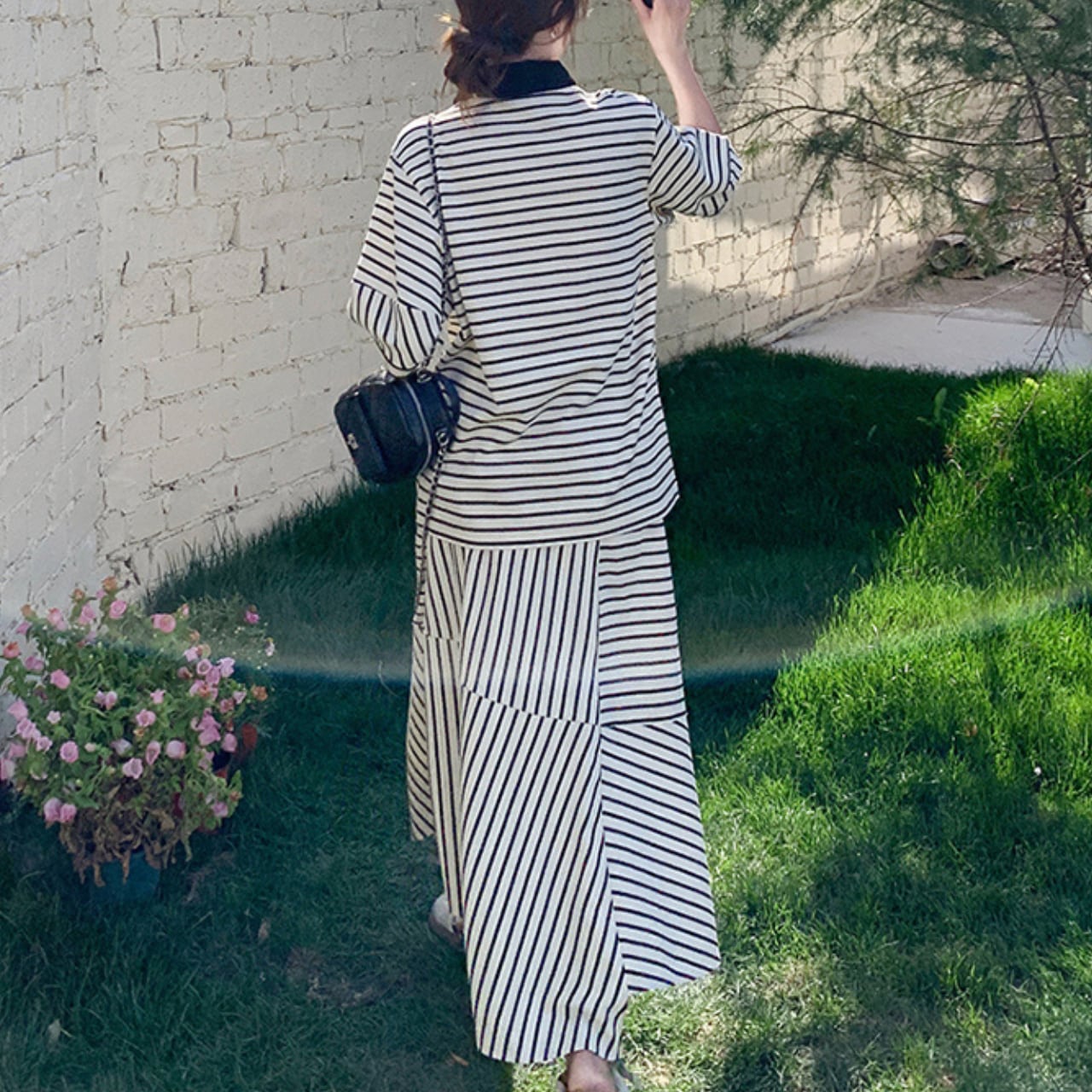 Striped polo collar T-shirt & skirt set S774