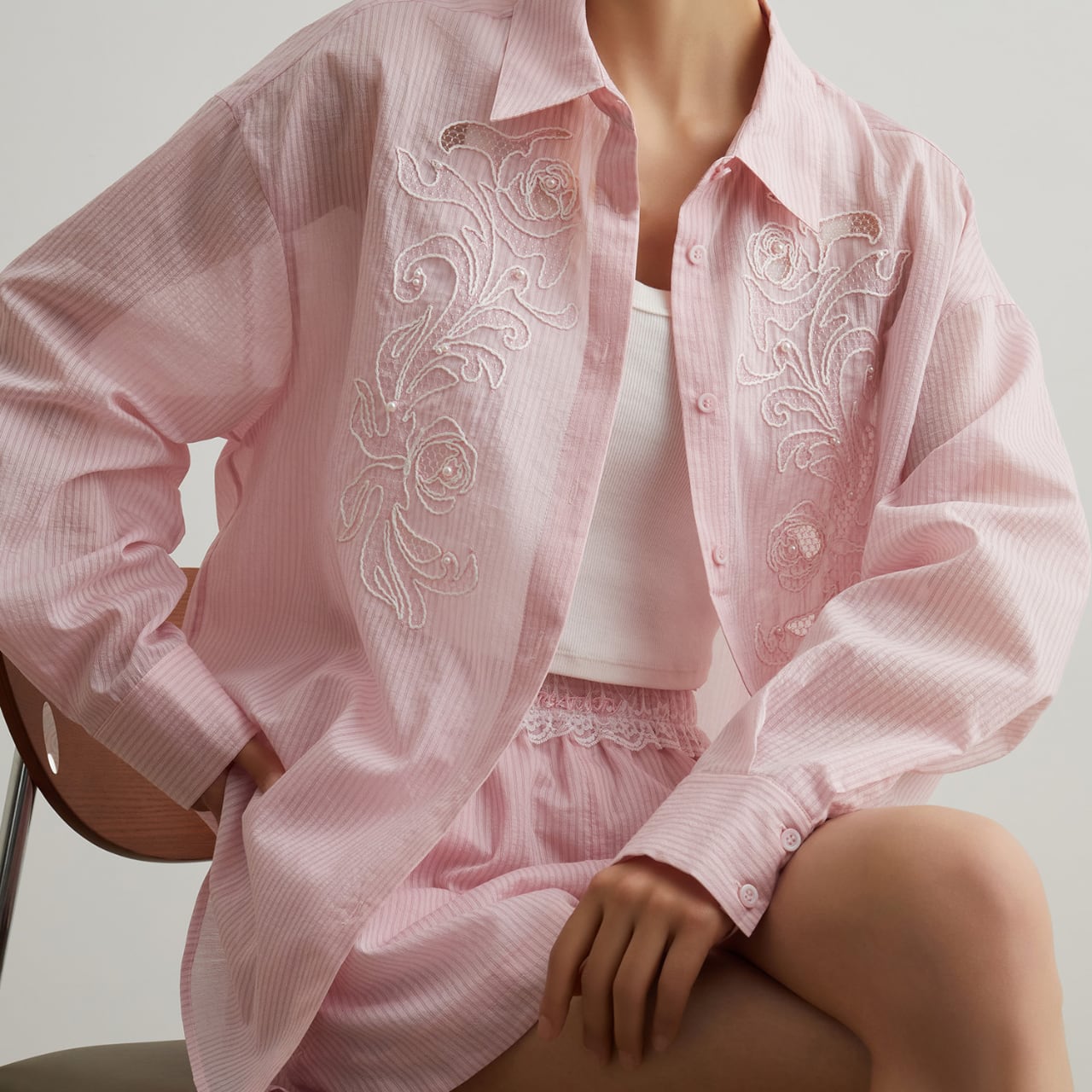 ソフトなピンクの生地に、胸元の繊細な刺繍がアクセントになったシャツ。