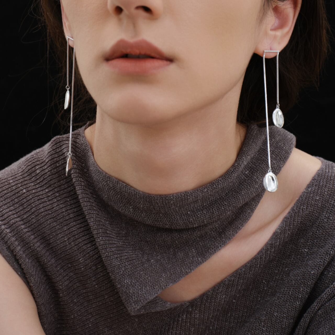 チェーンから吊り下げられたドロップモチーフが、歩くたび、振り向くたびに優雅に揺れて光を反射。