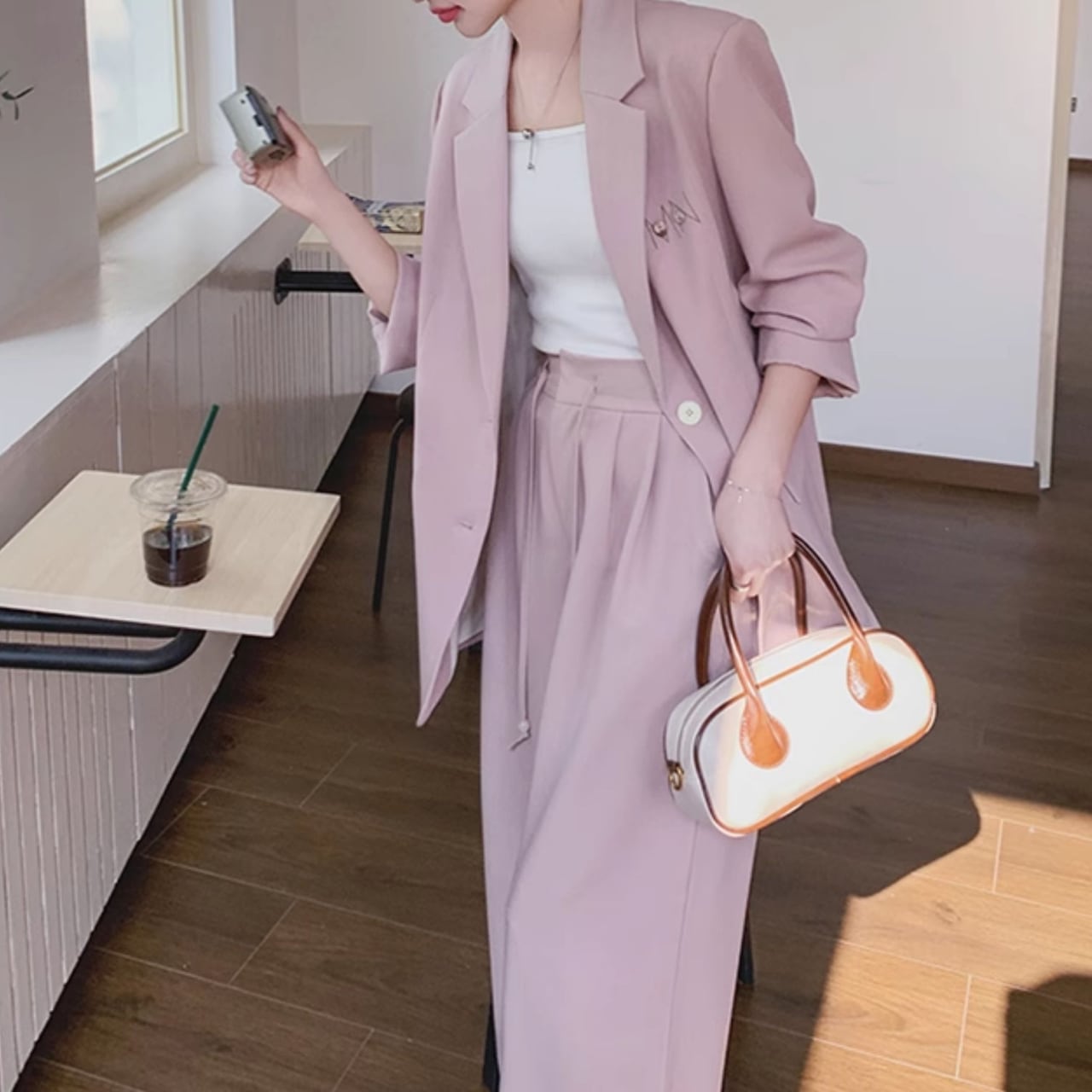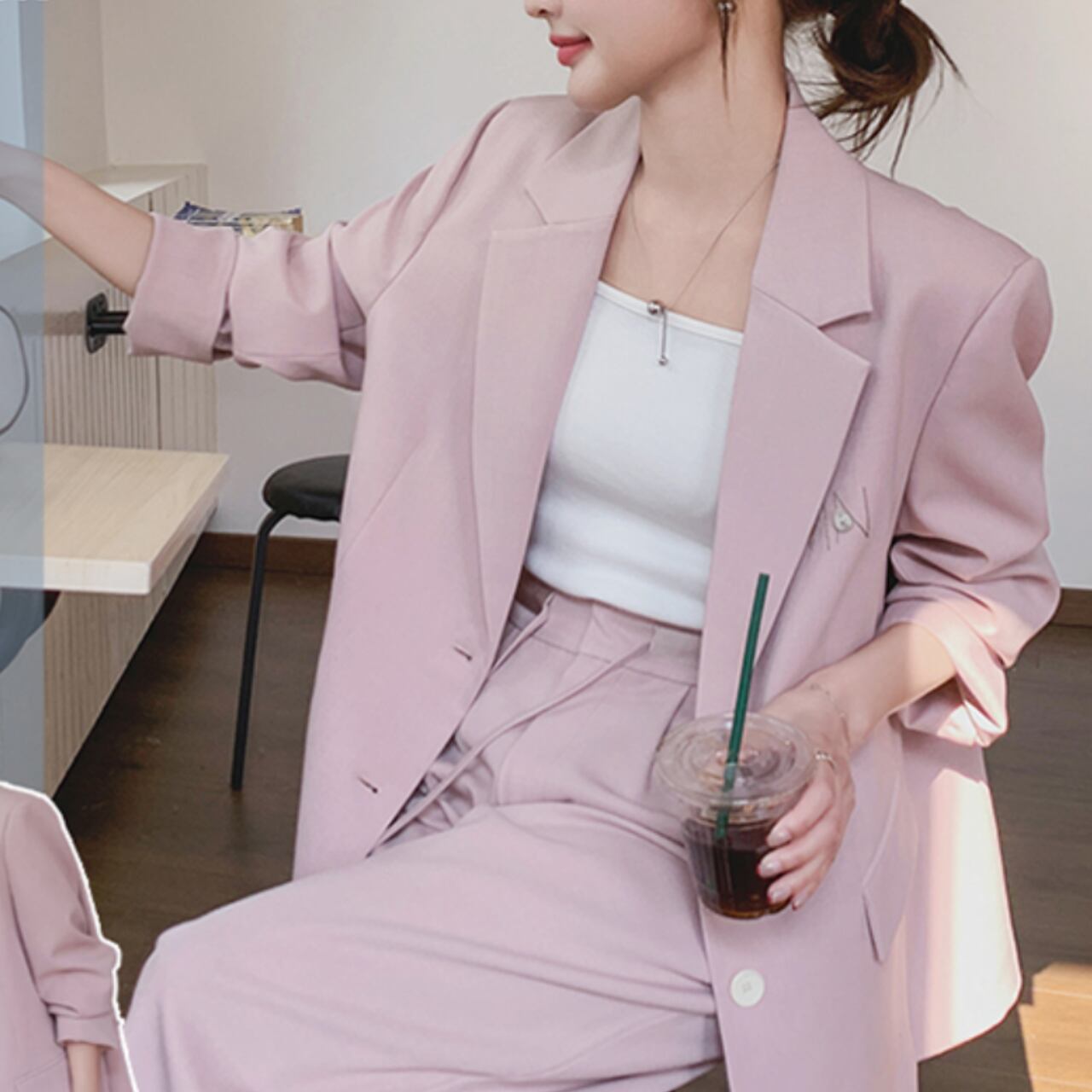 柔らかなピンク色が魅力的なジャケットと、トレンドのワイドレッグパンツがセットになったアイテム。