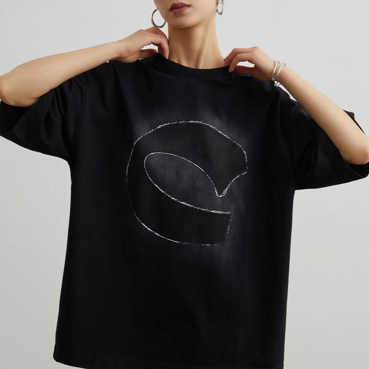 シンプルなブラックに、個性的なプリントが施されたTシャツです。