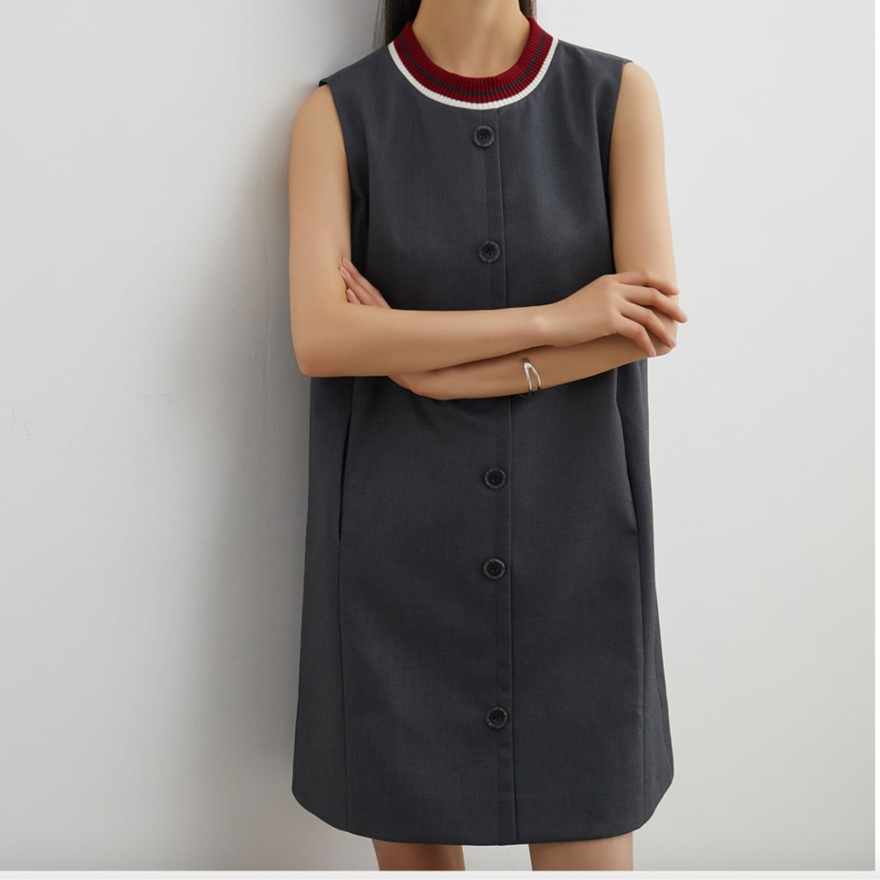 シンプルなノースリーブワンピースに、襟元の配色ラインがアクセントをプラス。