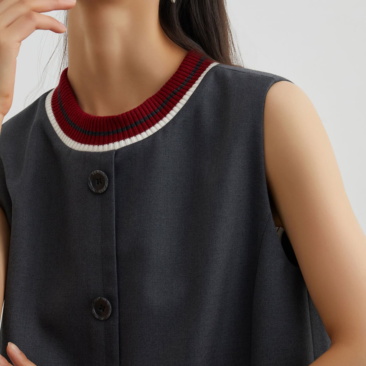 ネックラインに施されたコントラストカラーが、顔周りをパッと明るく見せ、シンプルながらも印象的なデザインに仕上げています。