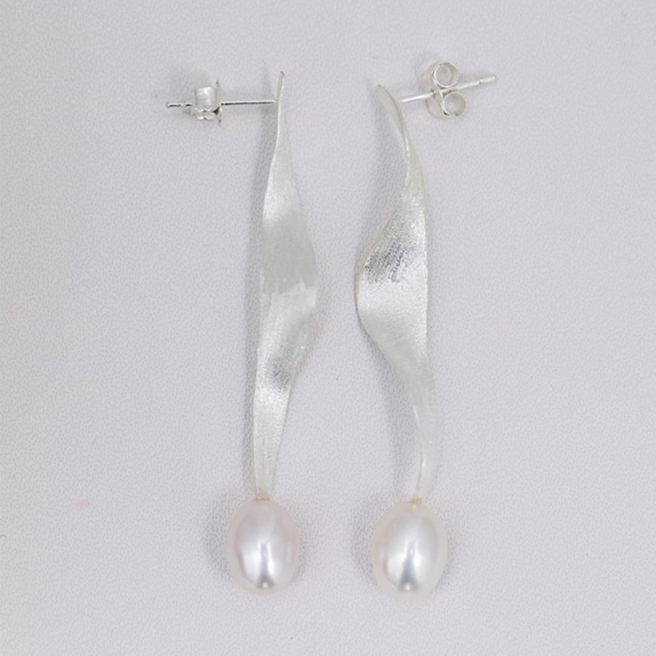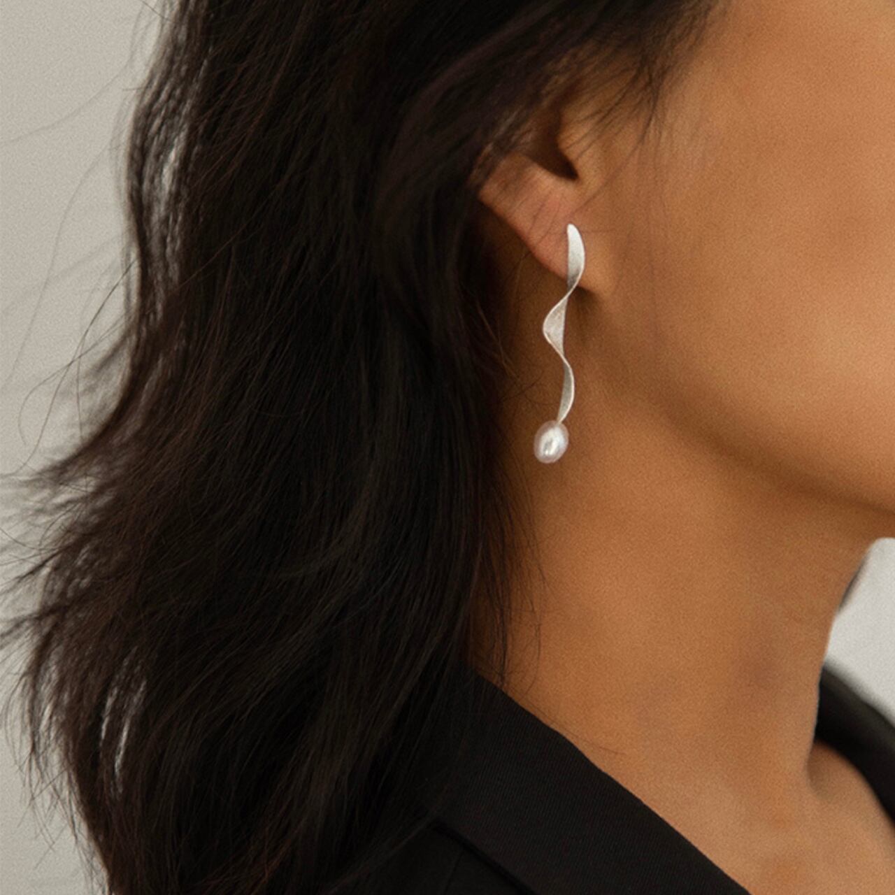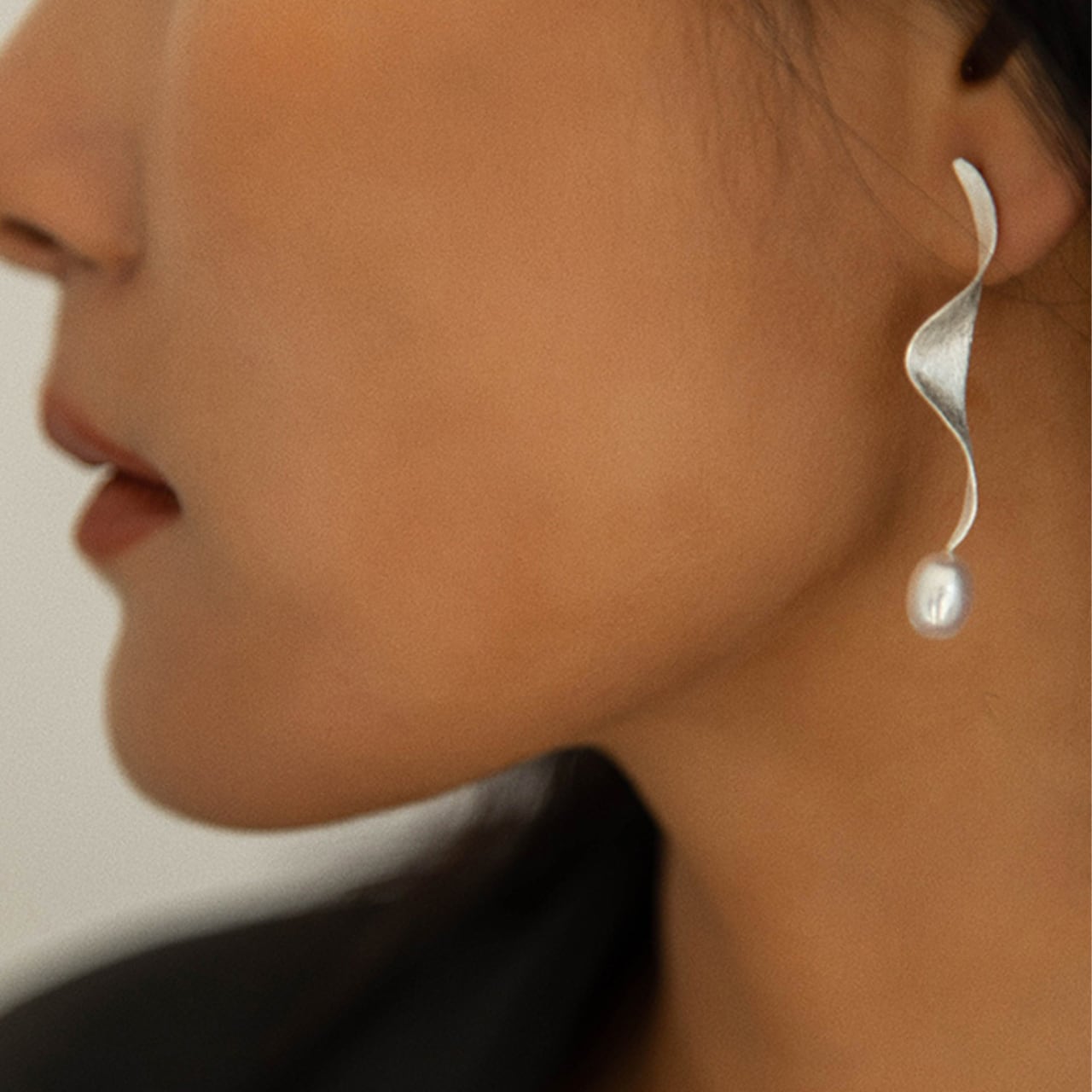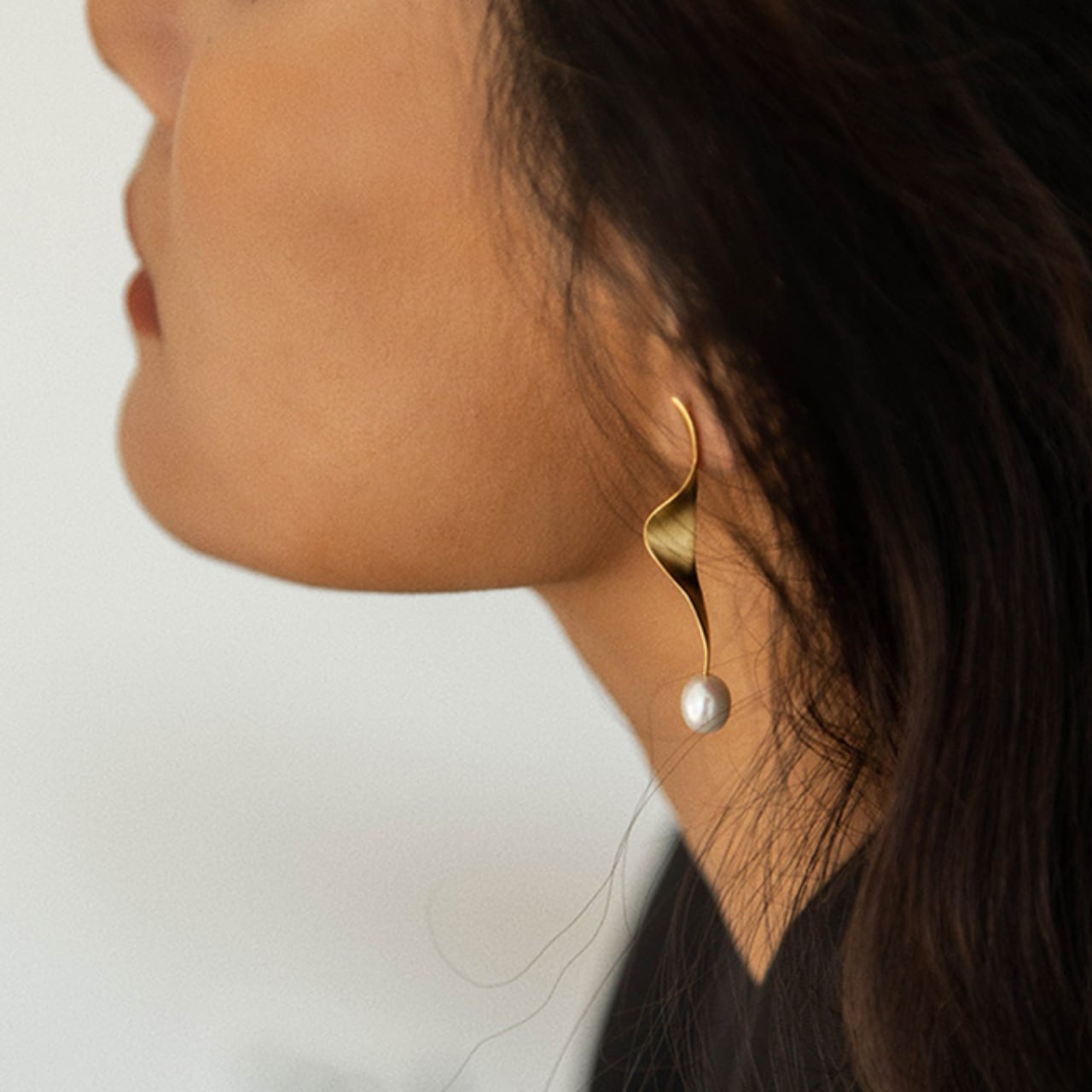 波のような柔らかなデザインと上品なパールが相まって、耳元を華やかに演出します。