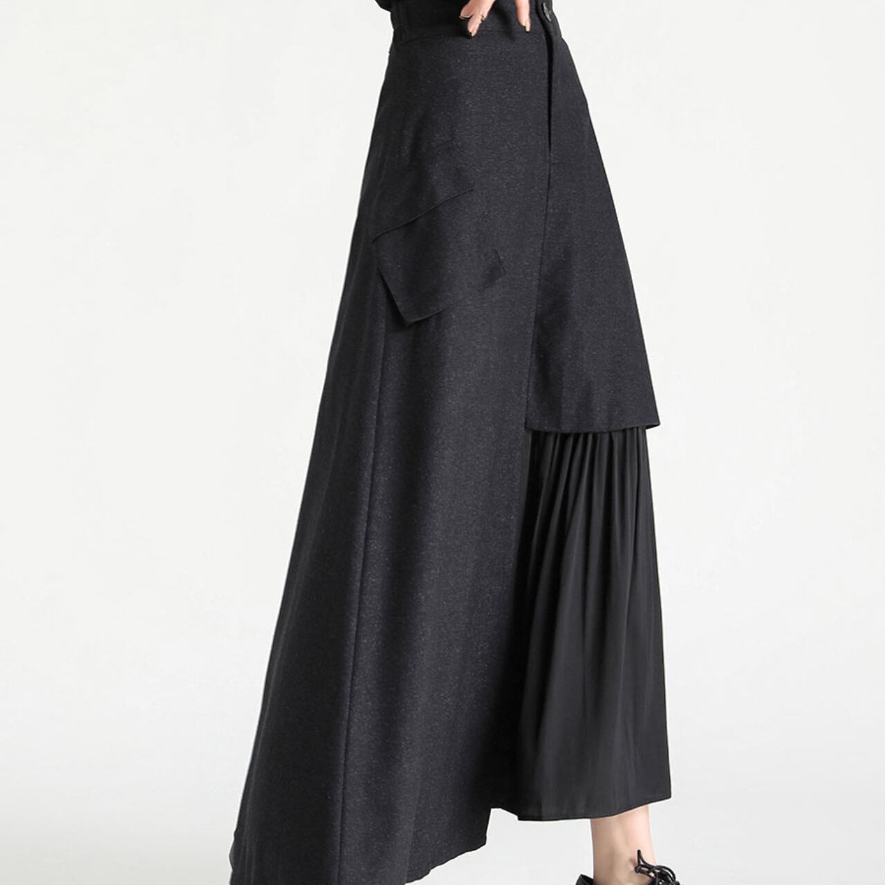 左右で異なる表情を持つ、大胆なアシンメトリーデザインが目を惹くロングスカート。