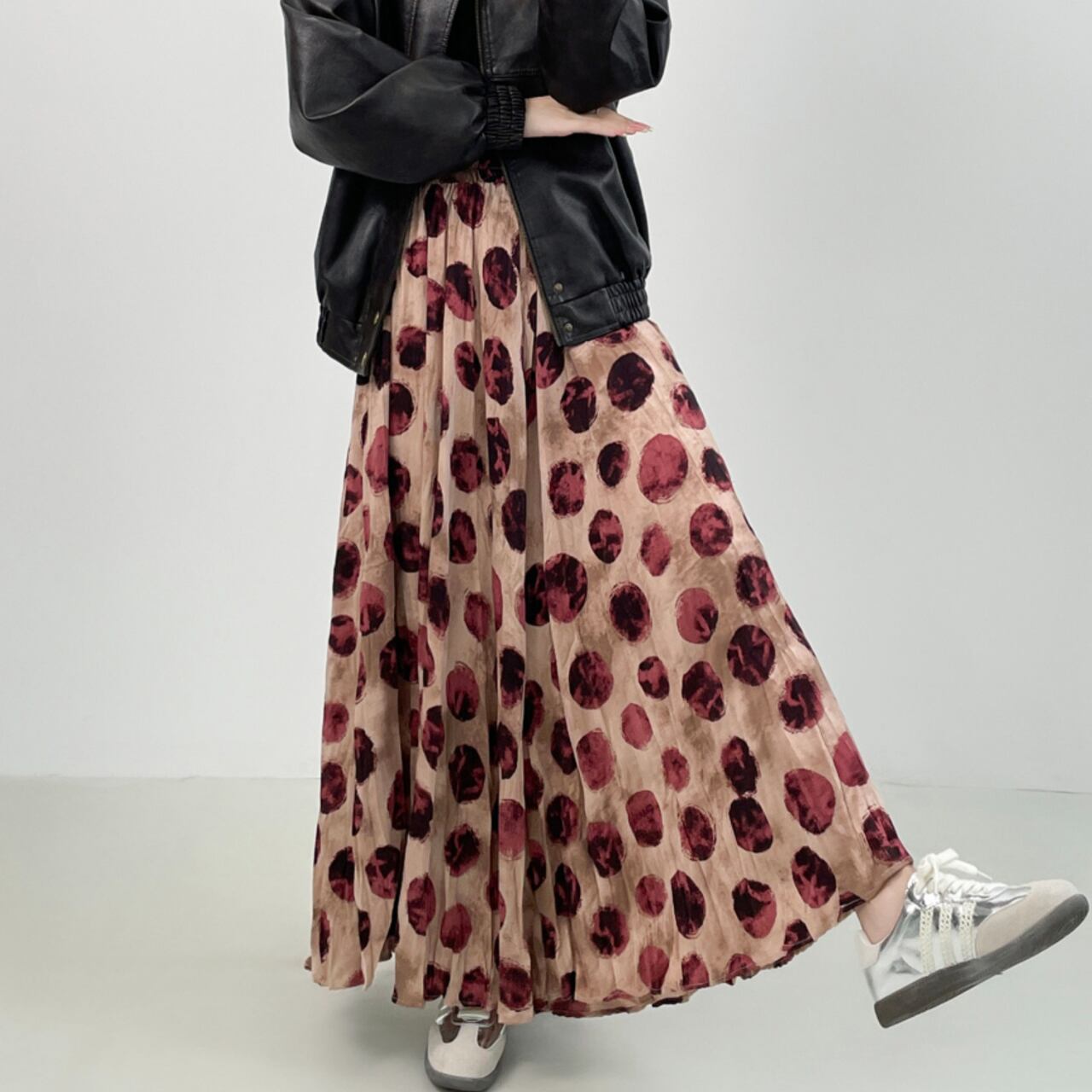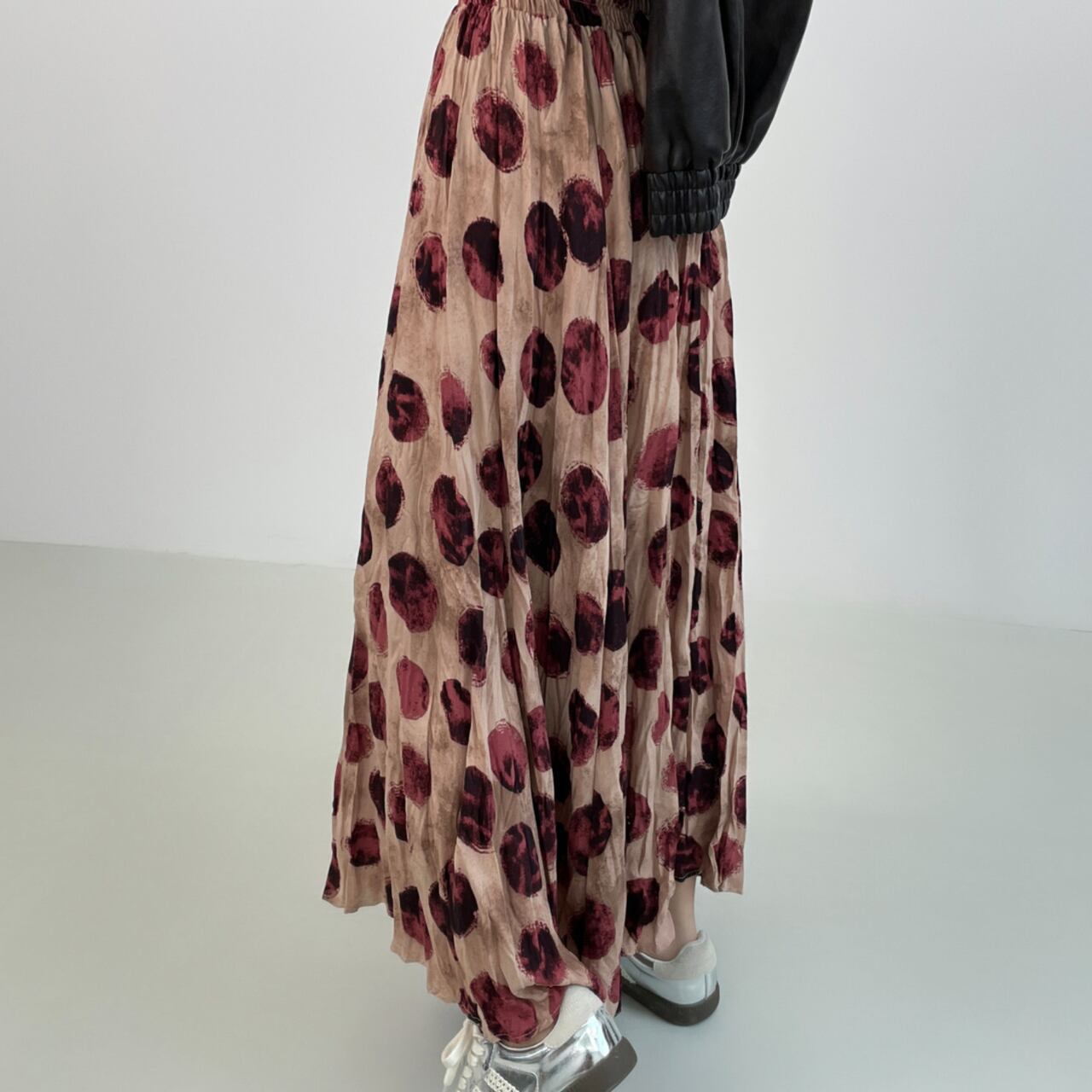 柔らかな風合いの水玉のプリーツデザインロングスカートです。
