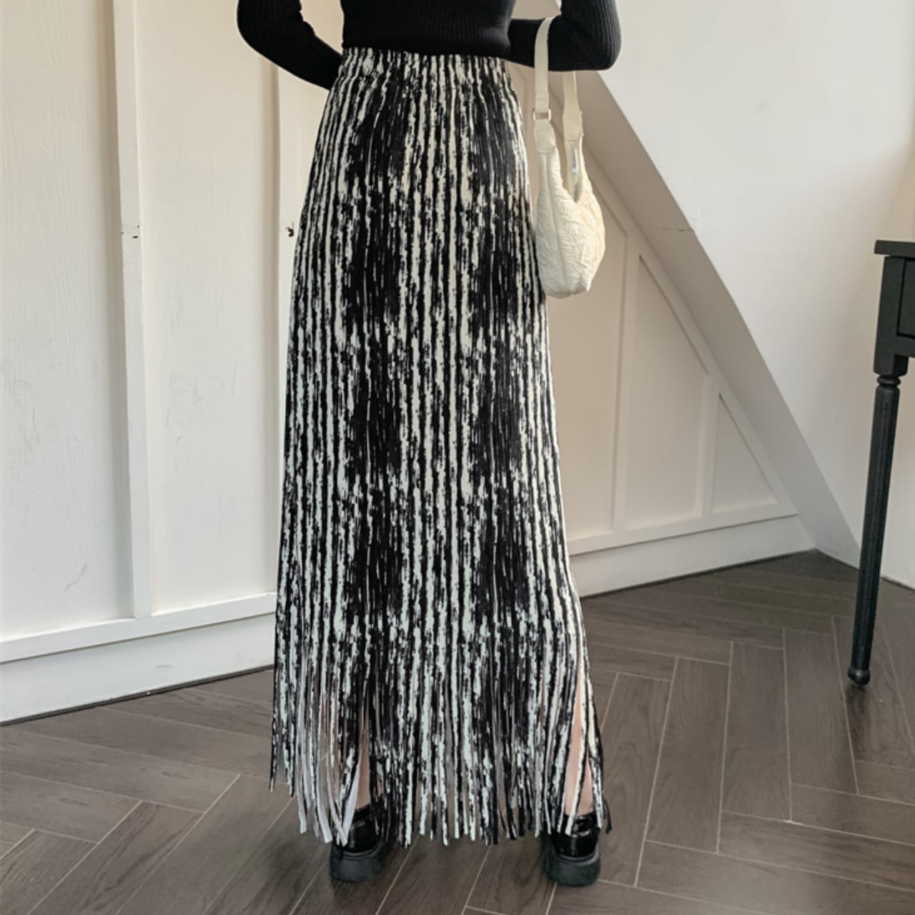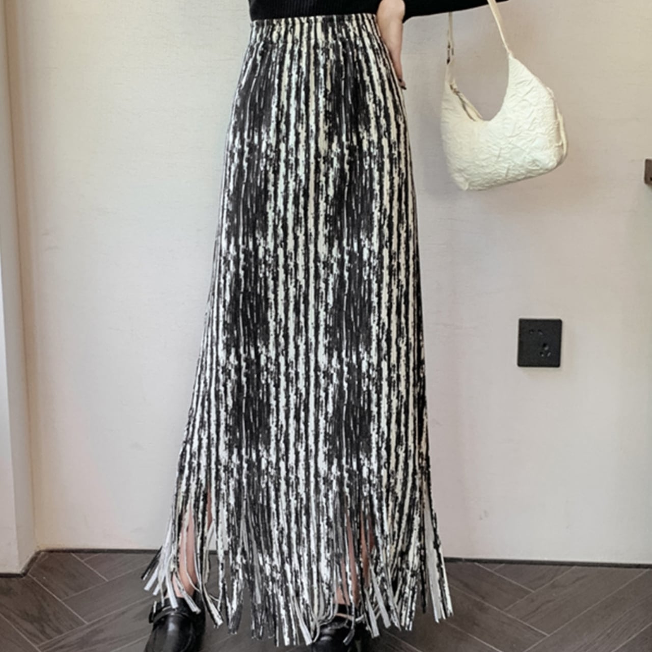 タッセルの重みで生まれる縦のラインが、脚を長く細く見せる効果を発揮し、全体のバランスを整えます。