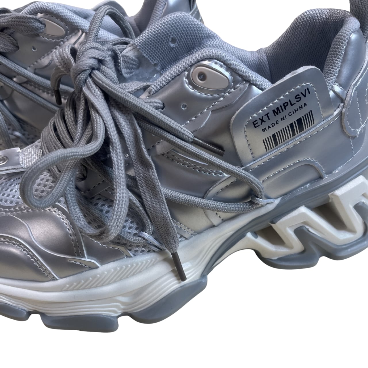 メタリックシルバーの輝きが、シンプルな装いに華やかさとエッジをプラス。