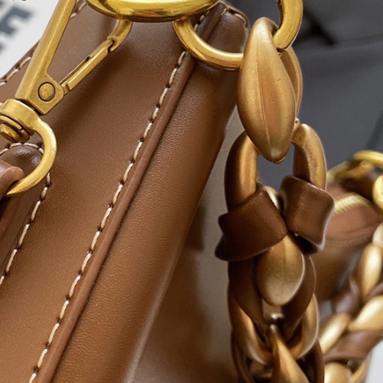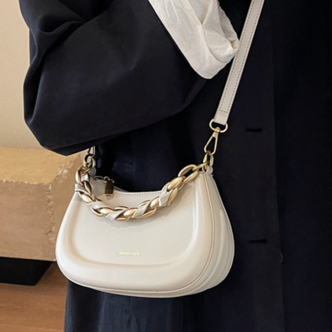 滑らかな曲線を描くコンパクトなボディに、存在感のある太めのゴールドチェーンハンドルを組み合わせた、洗練されたデザイン。