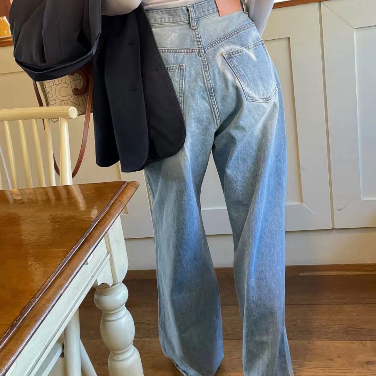 バックポケットに施されたハートモチーフがキュートなアクセントになる、ワイドレッグデニムパンツ。