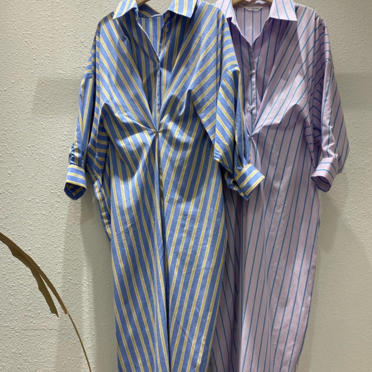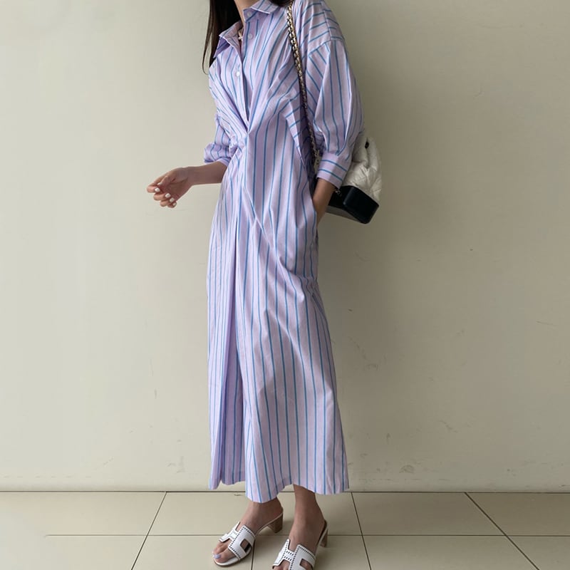 清涼感あふれるブルーのストライプが、着る人を品よく彩るシャツワンピース。