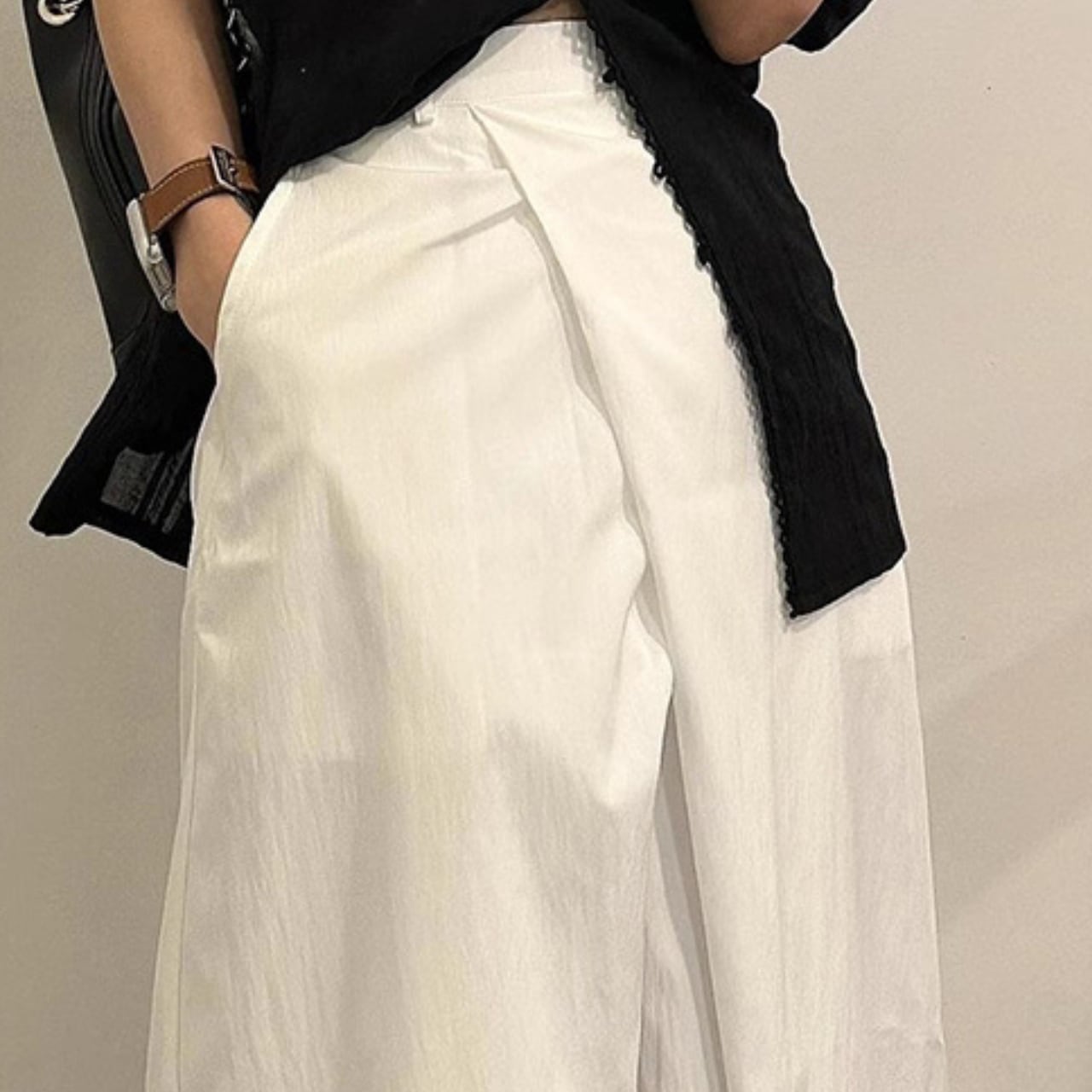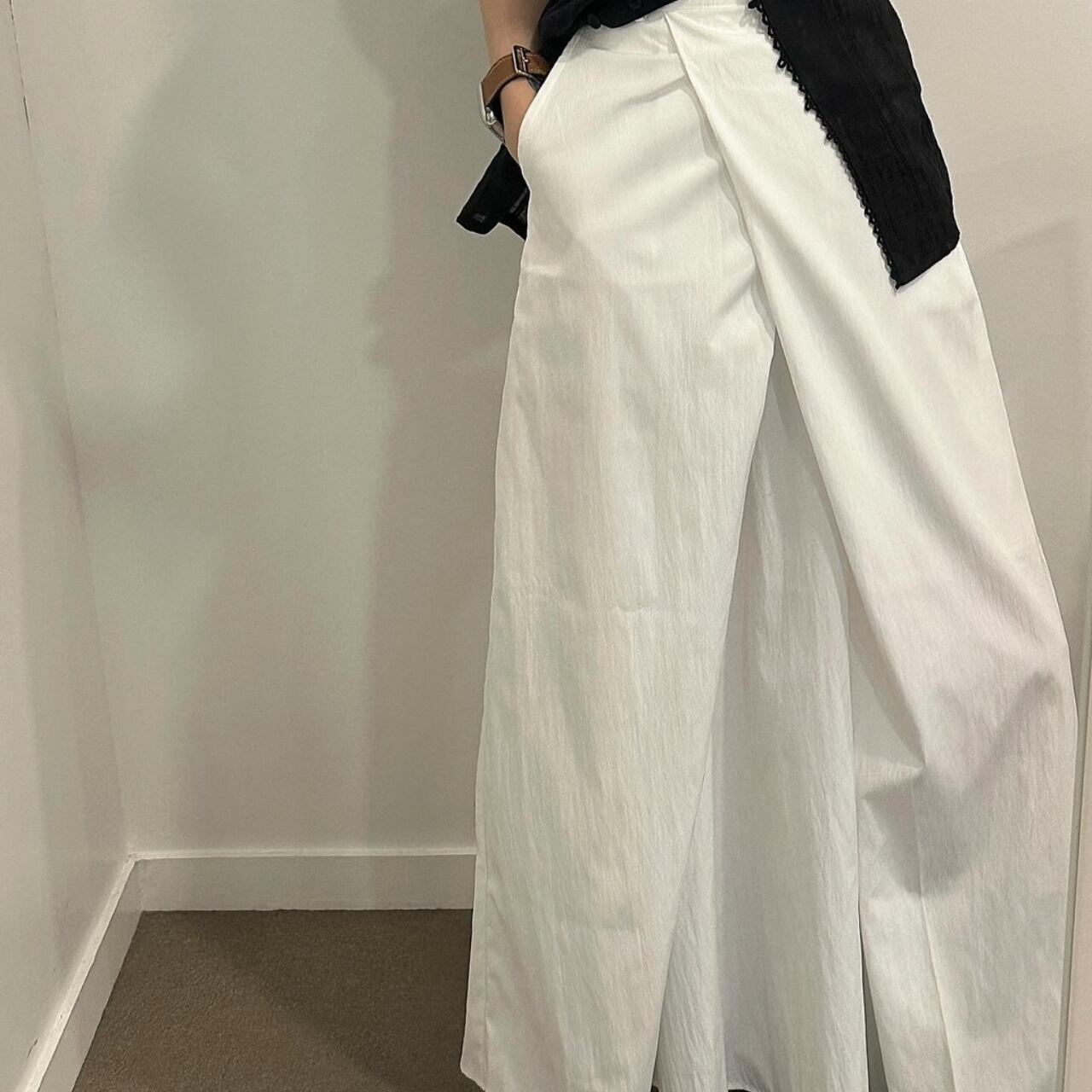 前面はプリーツを抑えたフラットなデザインで、すっきりとした印象に。お腹周りや腰回りをきれいにカバーしながら、膨張して見えない計算されたシルエット。
