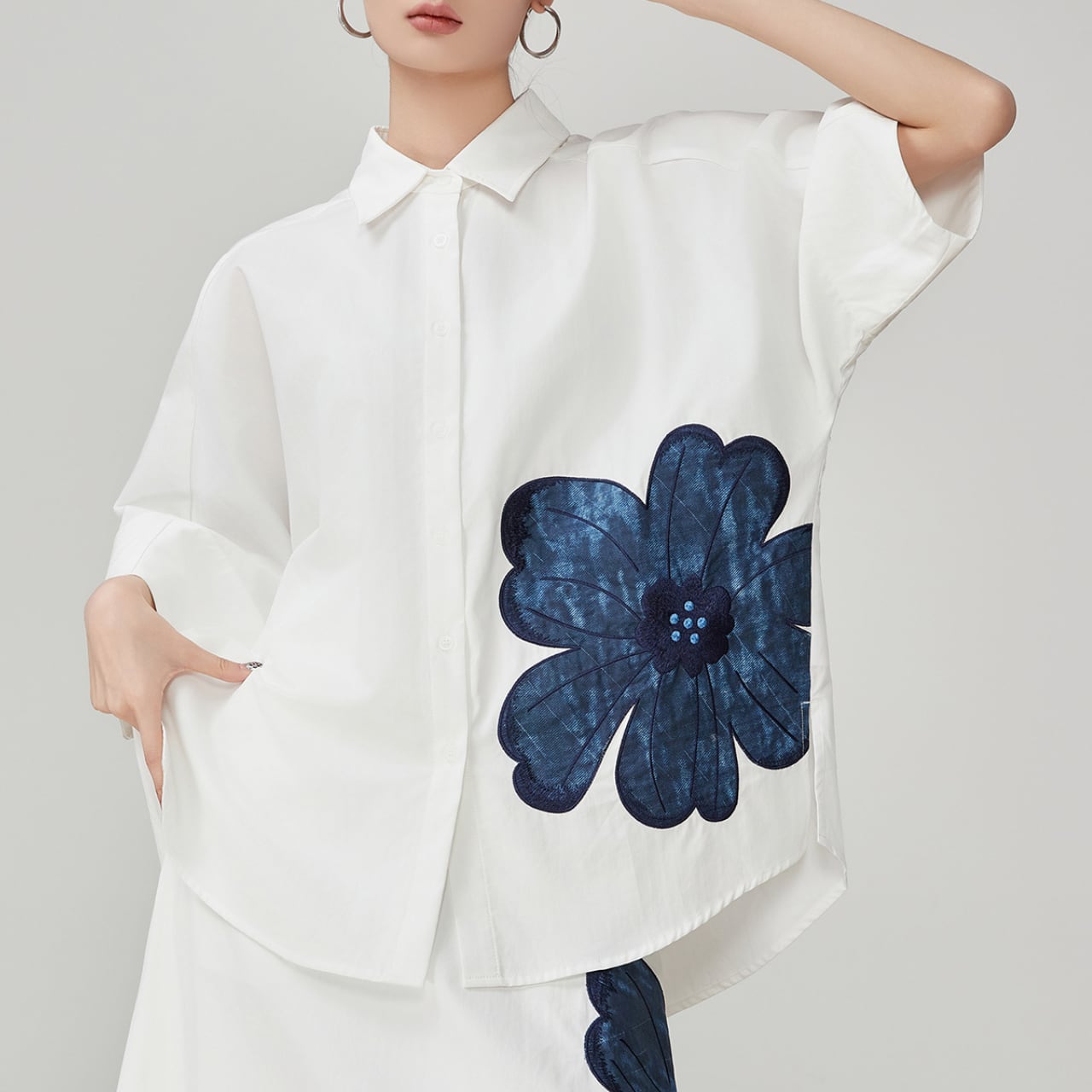 大きなブルーの花のデザインが施されたホワイトシャツです。