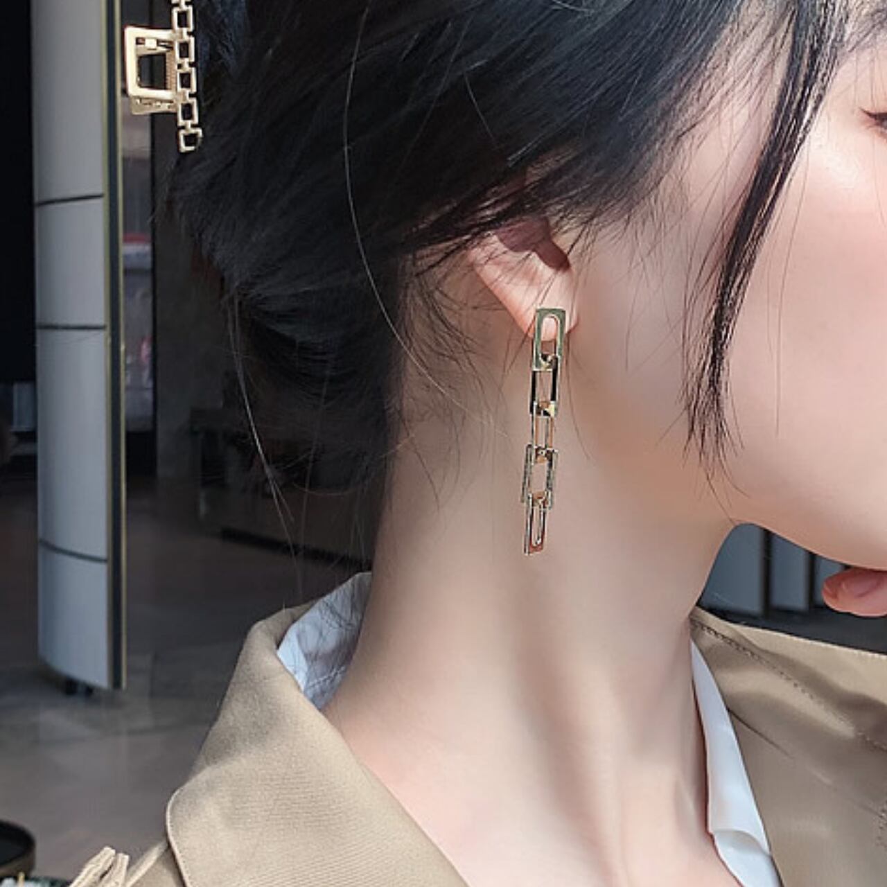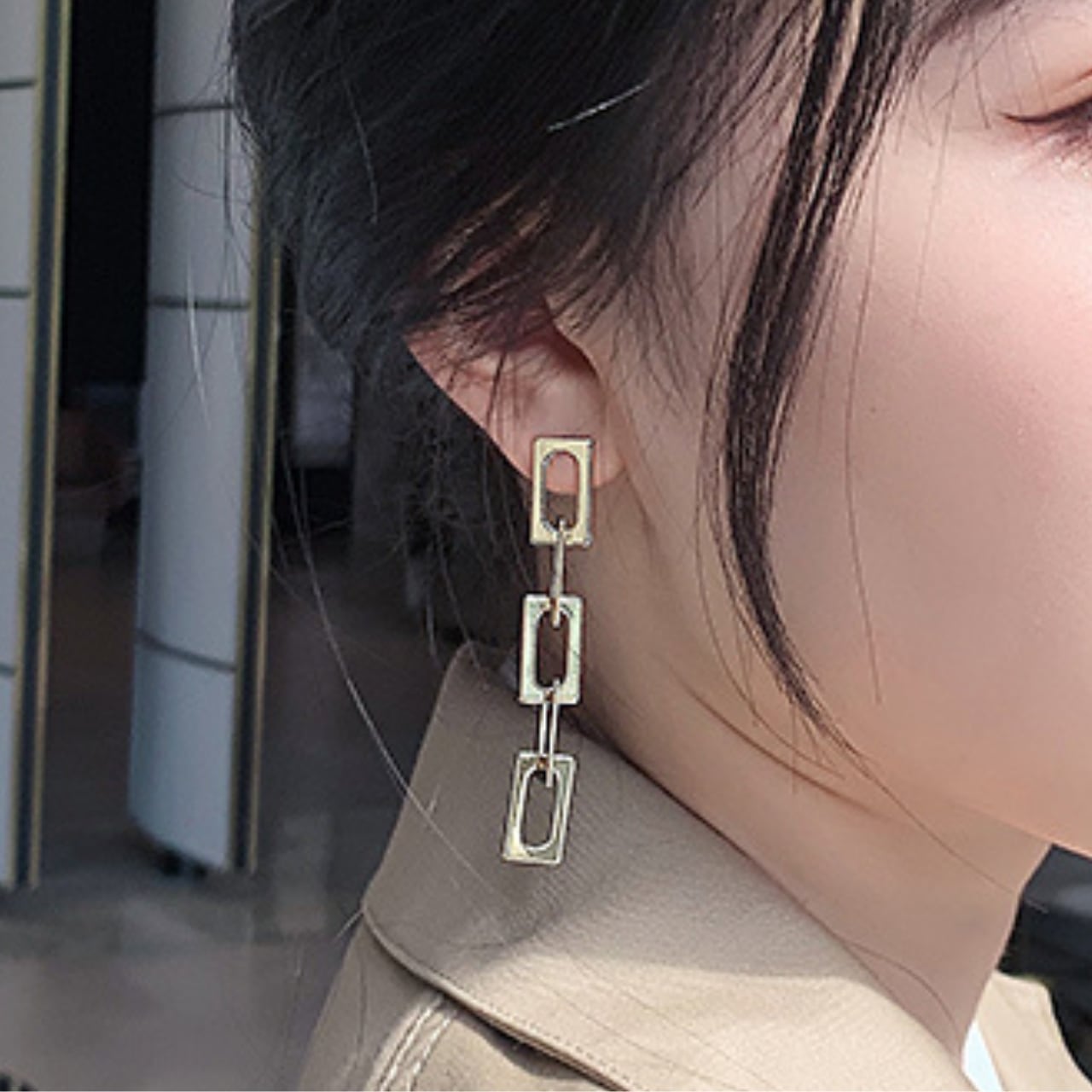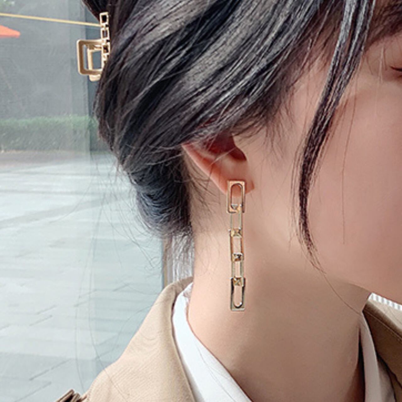 長方形のパーツが連なるミニマルデザインが、上品さと洗練さを耳元に宿します。