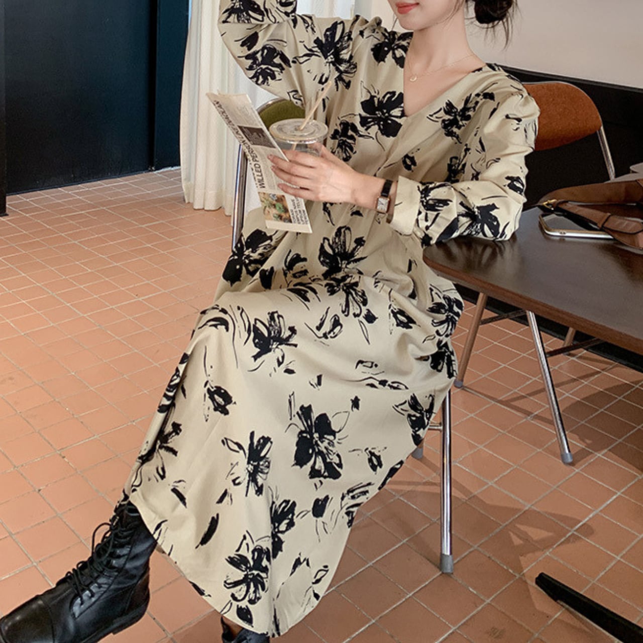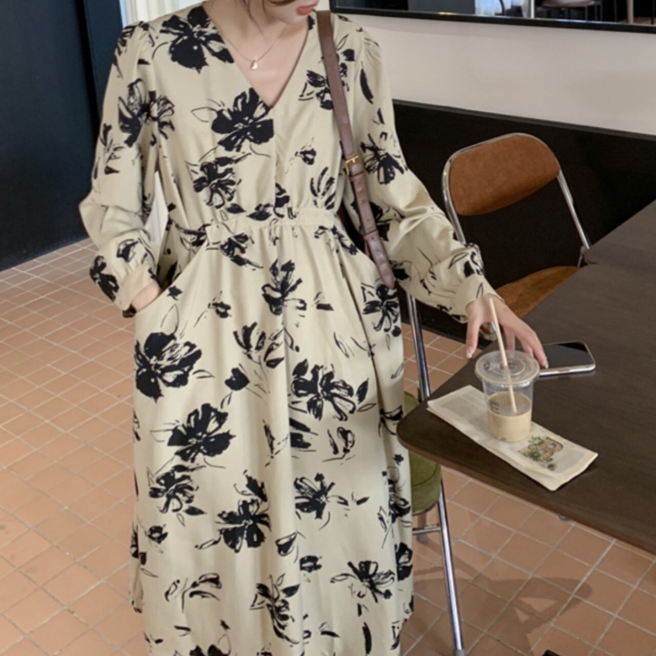 繊細な花柄が華やかさを引き立てる、長袖ワンピース。