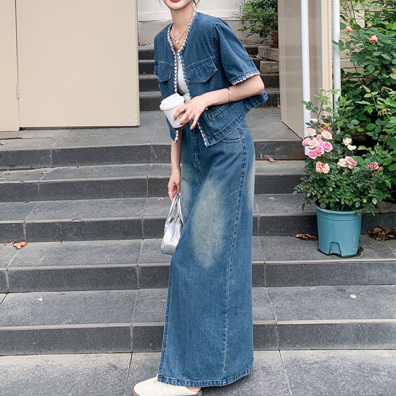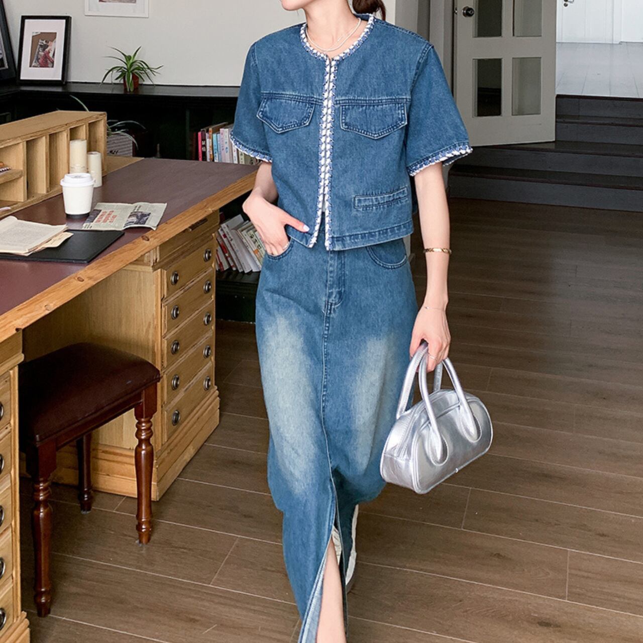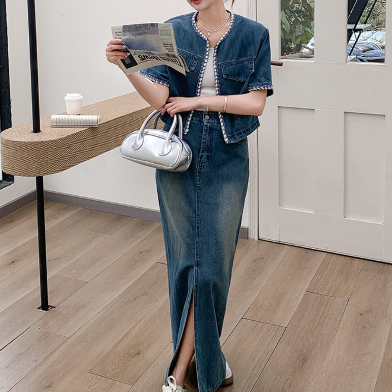 トレンド感満載のデニムジャケットとフロントスリットが印象的なスカートのセットアップ。 デニム素材の心地よい風合いが魅力で、さまざまなシーンに合わせてコーディネートが楽しめます。 ジャケットはノーカラーデザインで首元をスッキリ見せることができ、縁に施されたステッチがアクセントになっています。 スリミングスカートはフロントにスリットが入っており、女性らしさを与えるシルエットとなっています。 上下セットで着れば、今季トレンドのデニムオンデニムスタイルに。 Tシャツやブラウスの上に重ねてレイヤードスタイルを楽しむこともでき、シーズンレスで着回せる実用性の高さが魅力です。 アクセサリーやバッグ、シューズの選び方で様々な表情にコーディネートできます。 ■カラー ブルー ■サイズ トップス XS 着丈:42cm 胸囲:90cm 袖丈:18cm S 着丈:43cm 胸囲:94cm 袖丈:19cm M 着丈:44cm 胸囲:98cm 袖丈:20cm L 着丈:45cm 胸囲:102cm袖丈:21cm XL 着丈:46cm 胸囲:106cm袖丈:22cm 2XL 着丈:47cm 胸囲:110cm 袖丈:23cm スカート XS 着丈:91cm ヒップ:86cm ウエスト:60cm S 着丈:92cm ヒップ:90cm ウエスト:64cm M 着丈:93cm ヒップ:94cm ウエスト:68cm L 着丈:94cm ヒップ:98cm ウエスト:72cm XL 着丈:95cm ヒップ:102cm ウエスト:76cm 2XL 着丈:96cm ヒップ:106cm ウエスト:80cm ※採寸方法により1〜3cmの誤差がある場合がございます。 ■モデル 身長: 165cm 体重:46kg Mサイズ着用 ◼️素材 綿95%、ポリエステル5% ■商品番号 S1056 ・・━━・・━━・・━━・・━━・・━━・・━━・・ 【お届けについて】 当ショップの商品は海外より取り寄せ・発送となりますので、ご入金から3〜4週間前後で発送いたします。 【お支払い方法について】 ・クレジットカード決済(VISA/Master/JCB/AMERICAN EXPRESS) ・キャリア決済(docomo/au/Softbank/Y!mobile) ・あと払い Pay ID決済 【注意事項】 ・商品の在庫切れや生産中止、生産遅延が発生した場合は、注文キャンセルとなる可能性がありますので、予めご了承ください。 ・こちらは輸入品となりますので、日本製品とは検品基準が異なります。新品未使用品でもごくわずかな汚れや傷がある場合がございます。 ・イメージ違いやサイズ・カラー相違による返品・交換はお断りします。 ・お手持ちのスマートフォンやパソコンの液晶環境によって、商品のお色味が若干異なる場合があります。 ・発送時期によりデザイン・素材・細部が変更される場合があります。 ご購入前にこちらをお読みください →https://solemy.base.shop/blog/2024/11/20/121101 ・・━━・・━━・・━━・・━━・・━━・・━━・・