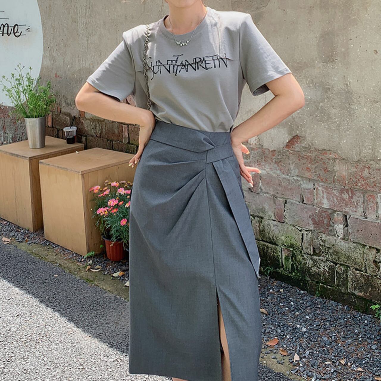 グレーのTシャツとハイウエストスカートのセットアイテム。