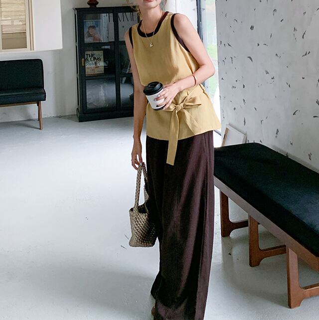 淡いイエローのノースリーブトップスにダークブラウンのワイドレッグパンツを組み合わせたスタイリッシュなセットアップです。 トップスはウエストのタイディテールがアクセントになっており、袖口や首元のコントラストカラーデザインがオシャレな印象を与えます。 ダークなボトムスはエレガントな印象を与え、上下合わせることで洗練されたスタイルを作り上げます。 ミニマルなアクセサリーとフラットサンダルを合わせればデイタイムのカジュアルな装いに、ゴールドのジュエリーとウェッジサンダルを合わせれば夜のお出かけコーデにも。 それぞれ単品使いもできるので、着回し自在なアイテムです。 ■カラー イエロー ■サイズ トップス XS 着丈:52cm 肩幅:42cm 胸囲:88cm S 着丈:53cm 肩幅:43cm 胸囲:92cm M 着丈:54cm 肩幅:44cm 胸囲:96cm L 着丈:55cm 肩幅:45cm 胸囲:100cm XL 着丈:56cm 肩幅:46cm 胸囲:104cm 2XL 着丈:57cm 肩幅:47cm 胸囲:108cm スカート XS 着丈:88cm ウエスト:52cm S 着丈:89cm ウエスト:56cm M 着丈:90cm ウエスト:60cm L 着丈:91cm ウエスト:64cm XL 着丈:92cm ウエスト:68cm 2XL 着丈:93cm ウエスト:72cm ※採寸方法により1~3cmの誤差がある場合がございます。 ■モデル 身長:165cm 体重:46kg Mサイズ着用 ◼️素材 ポリエステル98%、ポリウレタン2% ■商品番号 S1062 ・・━━・・━━・・━━・・━━・・━━・・━━・・ 【お届けについて】 当ショップの商品は海外より取り寄せ・発送となりますので、ご入金から3〜4週間前後で発送いたします。 【お支払い方法について】 ・クレジットカード決済(VISA/Master/JCB/AMERICAN EXPRESS) ・キャリア決済(docomo/au/Softbank/Y!mobile) ・あと払い Pay ID決済 【注意事項】 ・商品の在庫切れや生産中止、生産遅延が発生した場合は、注文キャンセルとなる可能性がありますので、予めご了承ください。 ・こちらは輸入品となりますので、日本製品とは検品基準が異なります。新品未使用品でもごくわずかな汚れや傷がある場合がございます。 ・イメージ違いやサイズ・カラー相違による返品・交換はお断りします。 ・お手持ちのスマートフォンやパソコンの液晶環境によって、商品のお色味が若干異なる場合があります。 ・発送時期によりデザイン・素材・細部が変更される場合があります。 ご購入前にこちらをお読みください →https://solemy.base.shop/blog/2024/11/20/121101 ・・━━・・━━・・━━・・━━・・━━・・━━・・