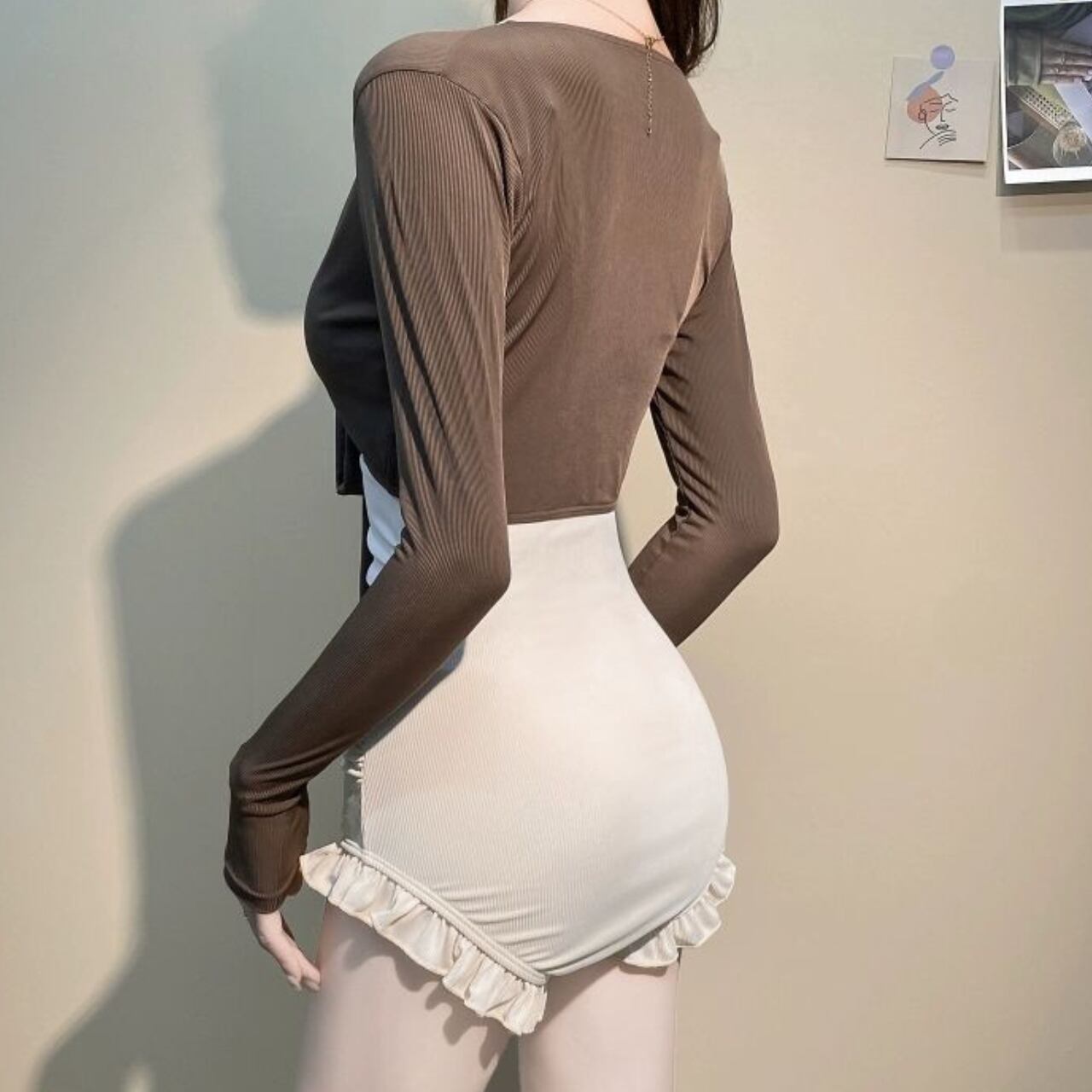 ワンピースタイプの水着は、上部がブラウンで下部はホワイトカラー。ハイウエスト仕様でスタイルアップも実現します。